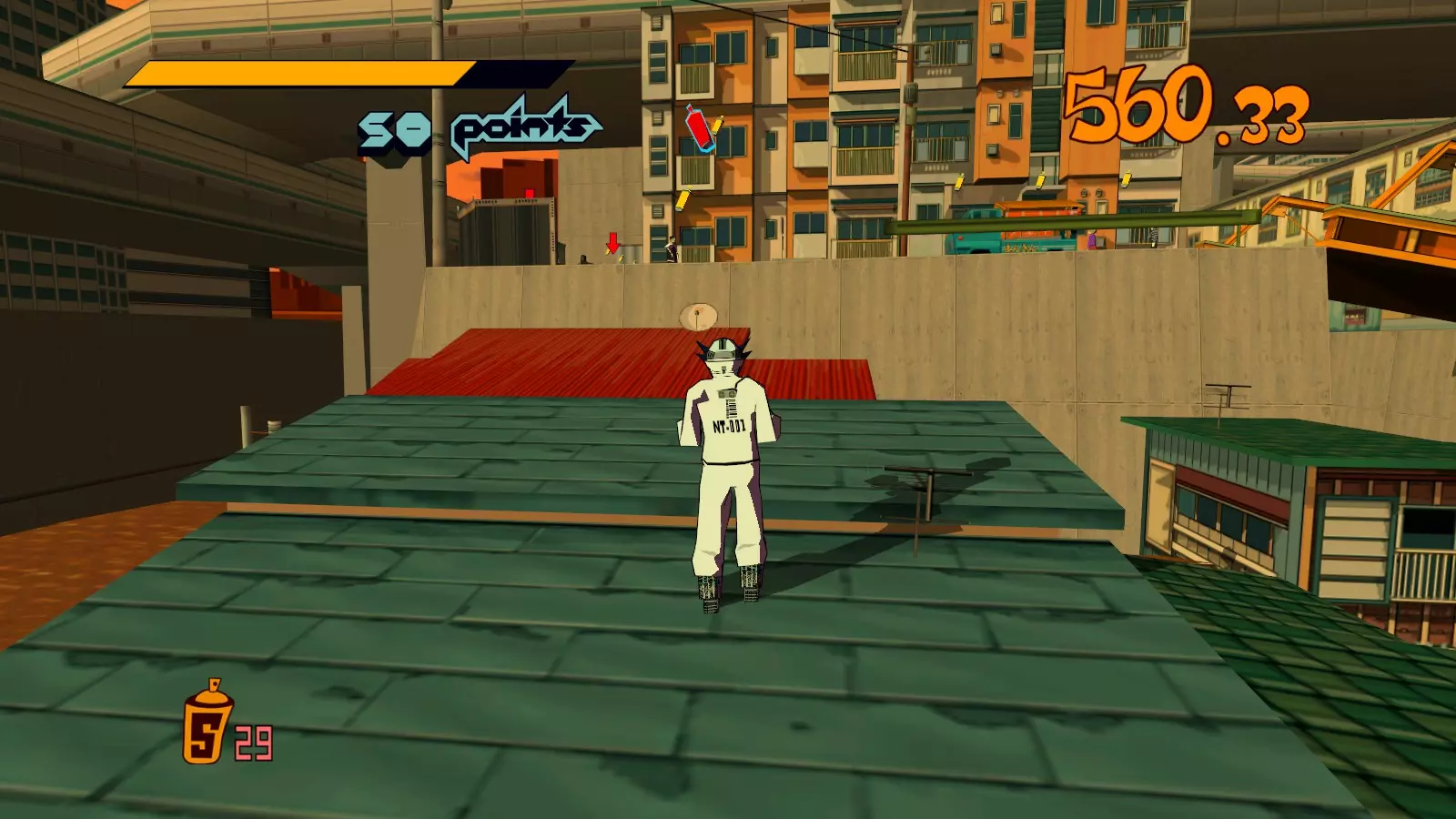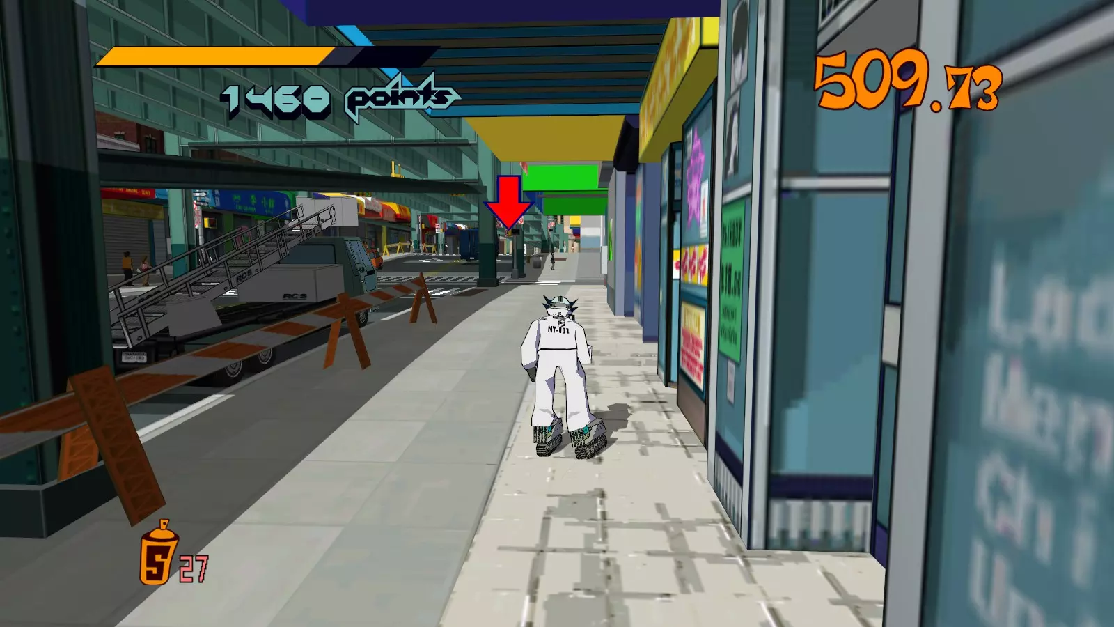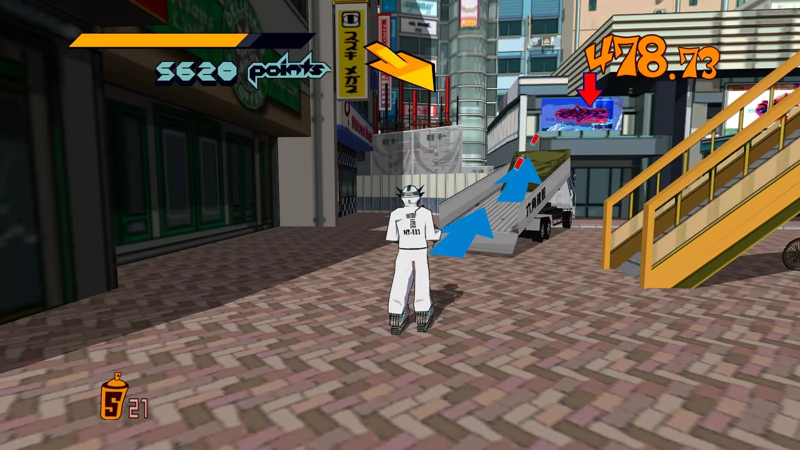 拿到屋顶上的大型涂鸦喷罐后,继续绕圈并跳到街道上。你要寻找一排黄色罐子,它们会引导你进入墙上的楼梯。沿着楼梯向上,就能到达顶部的大型涂鸦喷罐。