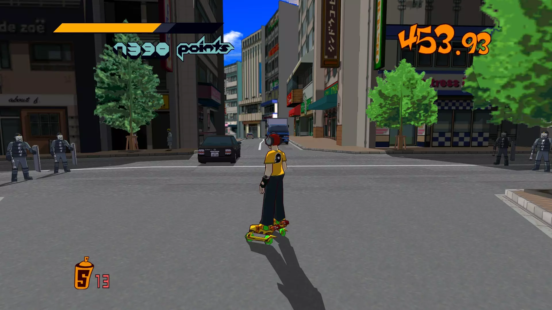 记住,当你靠近大型涂鸦点时,会有警用摩托车从人行道冲过来撞你。最好的做法是滑到涂鸦点附近触发它们出现,然后立刻滑开。如果它们没有被触发,可以尝试喷一下涂鸦点再离开,这样就能让它们生成。避开它们,以免导致失败。