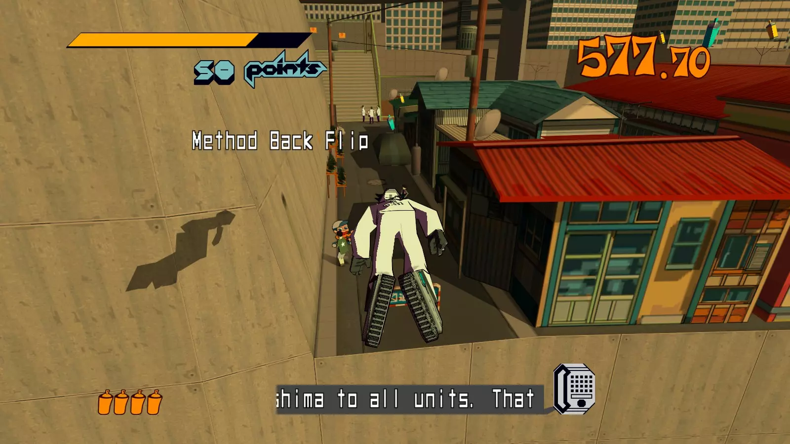 从新喷涂的大型涂鸦处跳过去,在不落地的情况下到达弯道处的小型涂鸦。跳到空调通风口上喷涂小型涂鸦,然后滑回屋顶。别忘了防止自己掉下去。警方将派出配备催泪瓦斯的特警队,现在所有吸附功能已禁用。