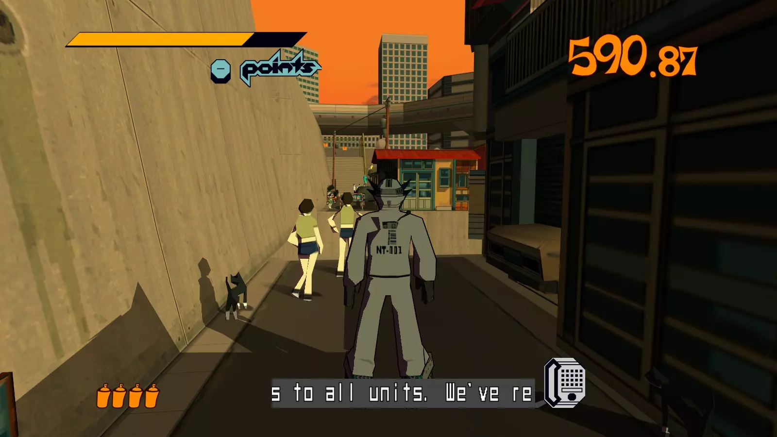 在完成接下来的两处涂鸦后,你的涂鸦总数将达到5个。完成第6处涂鸦后,特遣部队的队长将会出现。与其说他本身是个麻烦,不如说他的枪才是麻烦所在,但在这个关卡中他不成问题。