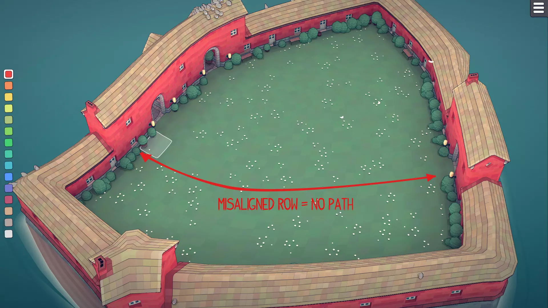 门不能错位,因此要确保它们位于同一连续行中,否则不会生成路径。此外,你不能在路径旁直接建造任何额外建筑,这会导致路径消失。