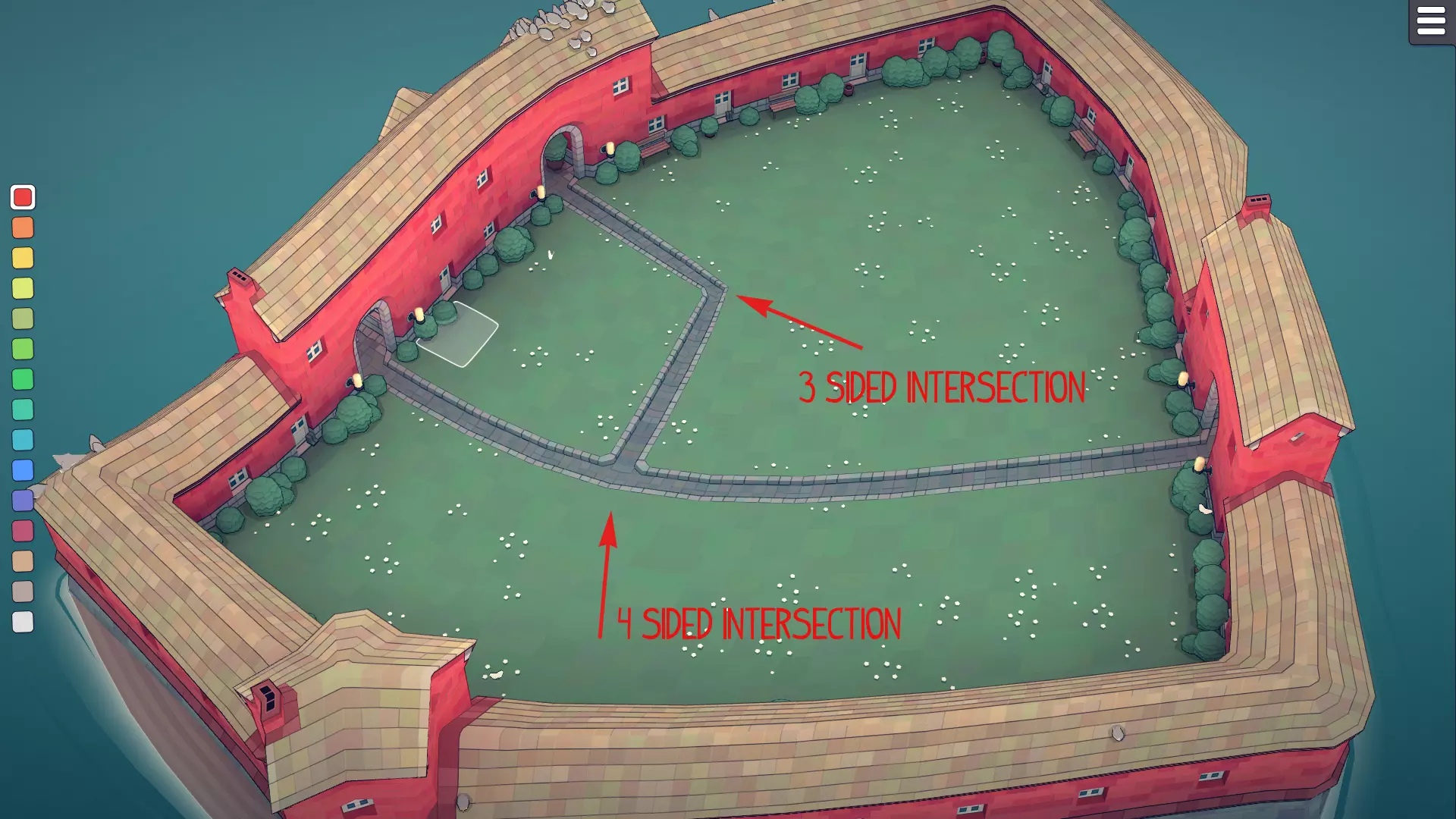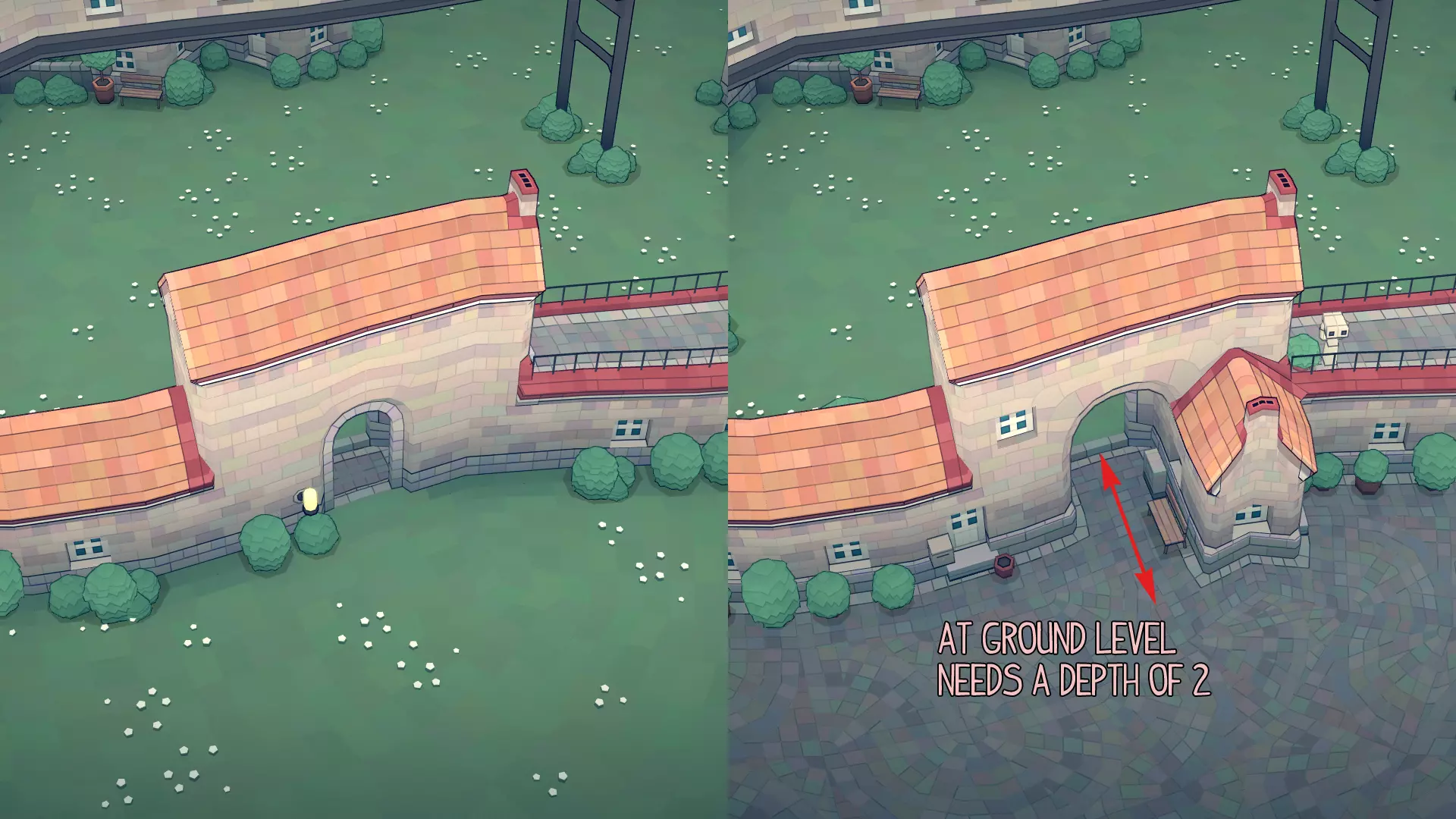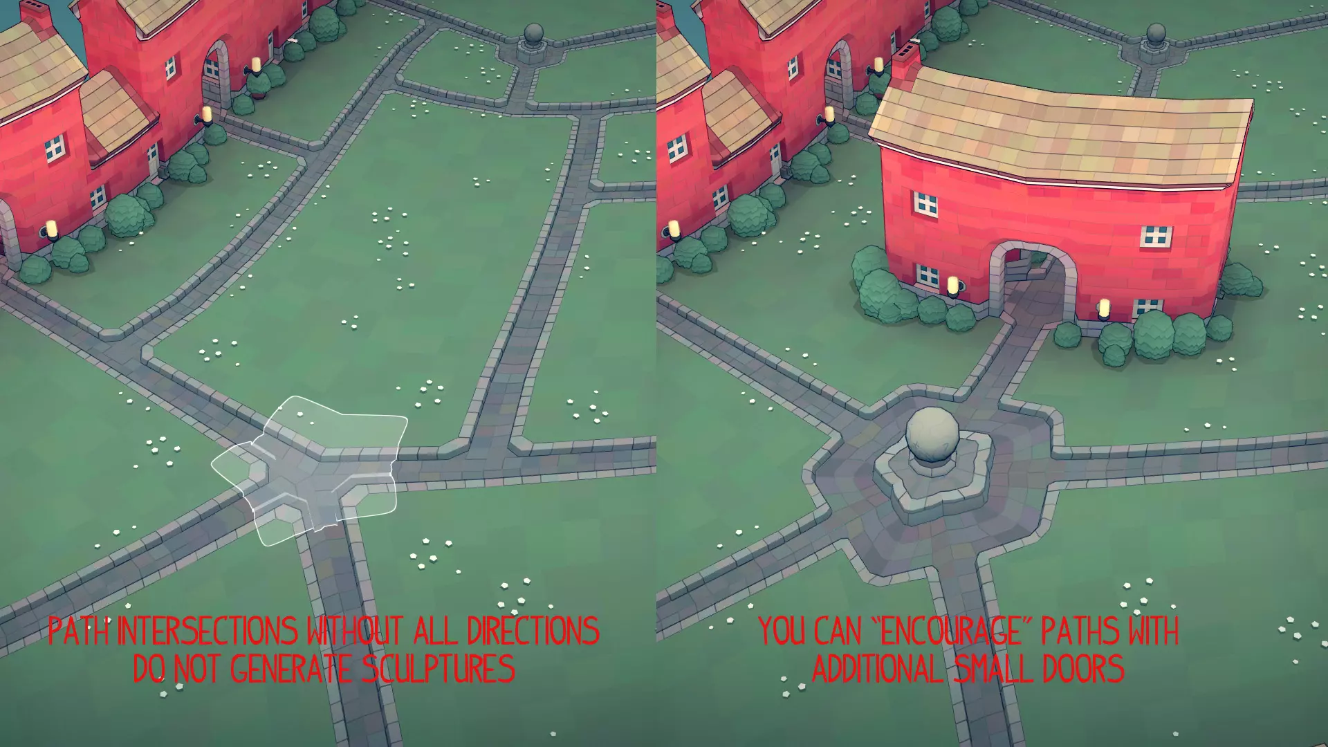我发现可以通过在2格高的墙壁上开设1格高的开口来添加更多小型花园门,以此影响路径的方向,如下所示。不过,拱门会生成花园墙,从而破坏路径。但如果花园墙较长,路径是有可能穿过它们的。 雕塑