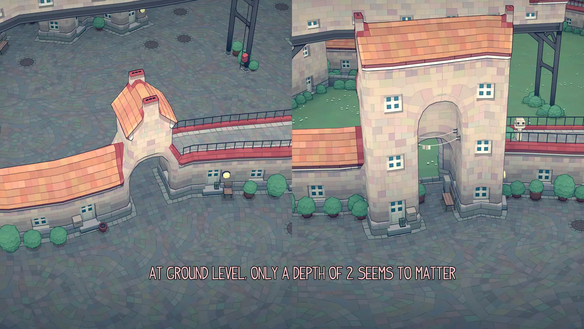 地面层 我下到地面层进行测试,发现处于最底部Z层时的规则与处于抬高区域时略有不同。 如下所示,在地面层,如果你使用1格高的门,它不会创建两个独立区域;但如果你将墙壁的最低部分哪怕延伸1格,门就会突然生效。