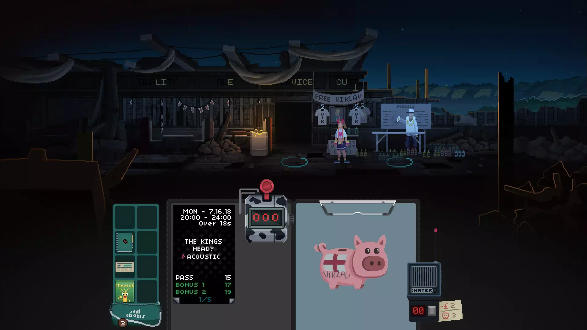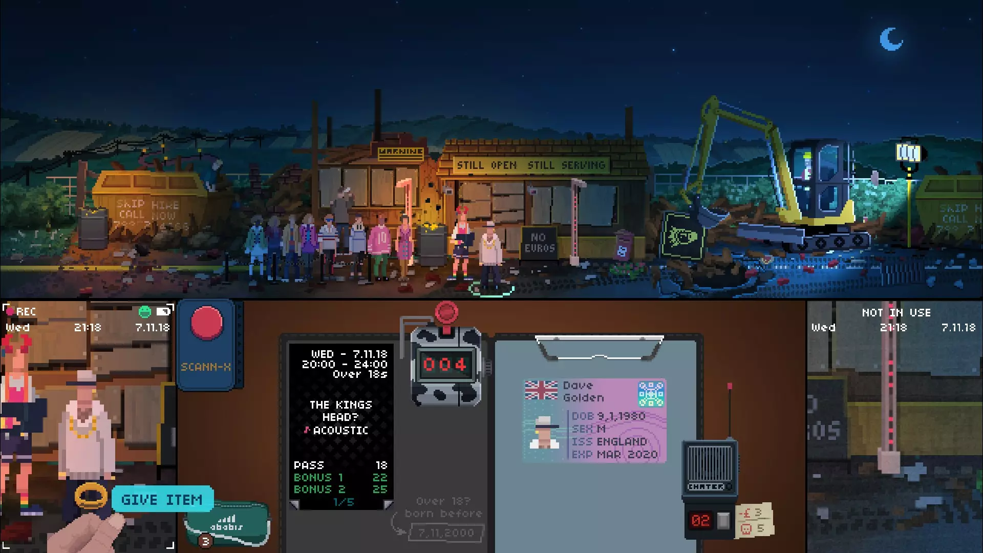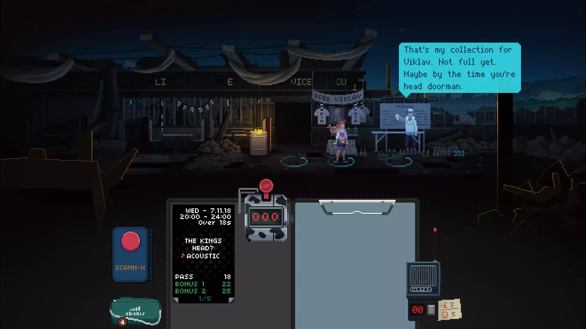 本指南将介绍如何在《Not Tonight》中达成“纯粹”结局,请阅读以下内容。 【免责声明:部分2018年拍摄的截图已不幸丢失,且由于我已两年未游玩该游戏,无法重新展示。本指南仅通过特定策略说明如何达成“纯粹”结局,我不确定是否有其他不同方式可达成该结局,这只是我两年前发现的方法。本指南也可能已过时,请自行斟酌尝试】 概述 《Not Tonight》指南:如何达成“纯粹”结局 警告:前方剧透!大家好,如果你正在阅读本指南,你很可能是新发布游戏《Not Tonight》的玩家。 《Not Tonight》是一款让你扮演保镖的游戏,你需要核验文件并让人们进入不同场所参加派对。它与《 Papers, Please》这类游戏相似,所以如果你喜欢这类游戏,推荐你入手《Not Tonight》。本指南将告诉你如何避免成为一个混蛋。 你可能会问一些问题: 引用自“小霸王”:我为什么要保持纯粹?这又不会影响我!没错,你可以选择做个坏人,但我制作本指南是为了让你了解如何达成《今晚没开》的真结局,没错,游戏有多个结局。 在游戏中保持友善非常重要,许多主要角色会在结局中对你的命运产生影响。 这些角色包括: 国王头像戴夫(最佳角色)