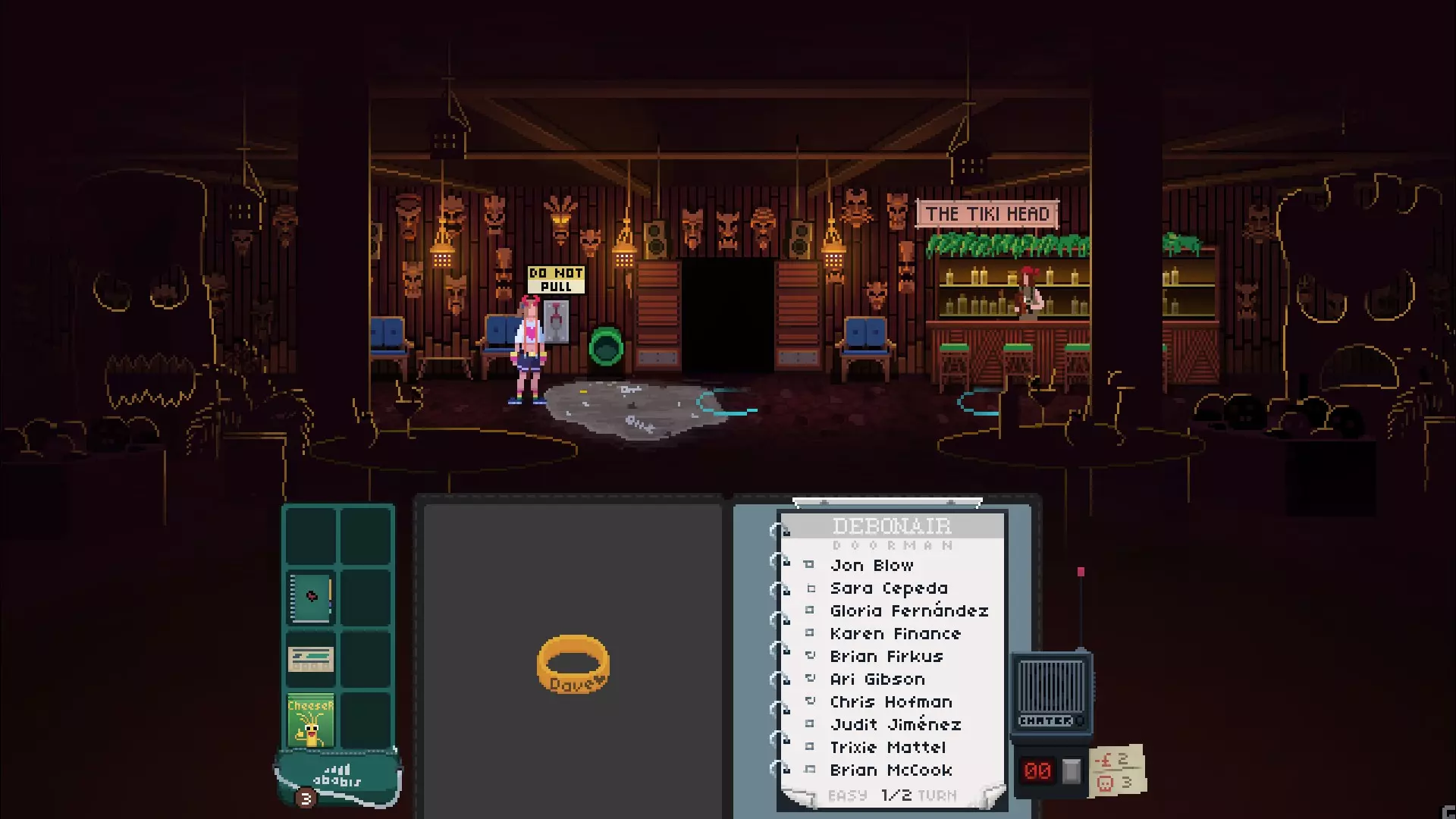 金头酒吧的戴夫,或者就叫戴夫……他是你作为保镖(bouncer)第一个为之工作的角色,也是最风趣的一个。你(主角)和戴夫在《今晚没门》的剧情中保持着友谊。在故事的结尾,他会和其他主要角色一起对你的性格进行评判,看你是个小混混(HOOLIGAN)还是个天使。他要么会说你是个消极的人,要么会说你是个优秀的欧洲人(GOOD EURO)。 在《今晚没门》中,要获得他的好感非常容易。在第二章,你陷入了为期三个月的保镖工作循环,戴夫的酒吧曾被摧毁,他为了拯救维克拉夫(我们稍后会提到维克拉夫)正重新开张。戴夫不幸丢失了他的戒指,而你作为他的英雄必须帮他找回来。在第二章开始时,提基之头酒吧会有一份保镖工作(白天或晚上班次均可)。戴夫经常在那里出没,所以你应该去那里调查一番,【你的名字】侦探!首先,你必须成为提基之头酒吧白天或晚上班次的首席保镖,如果你在不同夜晚分别选择两个班次,将无法完成此调查!成为“首席保镖”后,你将有权打开餐厅里的一根污水管——我知道这很恶心,但别问为什么。打开污水管后,你会找到一枚沾满污水的戒指并获得它!那就是戴夫的戒指! 现在问题来了: 引用自 Legit Physics Teacher:我怎样才能把这枚戒指从我的手里送到戴夫的手里?在“国王之首”工作期间,戴夫会在两个晚上出现并问你:“嘿,只是来看看你——你有没有看到我的戒指?”(突然问道)。此时,他脚下会出现一个蓝色光圈,点击该光圈后你可以与戴夫进行互动,这样你就有机会将手中的戒指递给他。哇哦,你掌握了关键操作!干得好,侦探! 以下是获取戴夫信任的方法指南: 步骤1:成为提基之首日班或夜班的门卫主管,哪个班次都可以。在成为主管后的当晚,打开一个下水道井盖,你会在那里找到戴夫的戒指。
