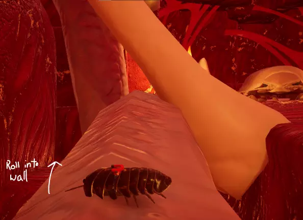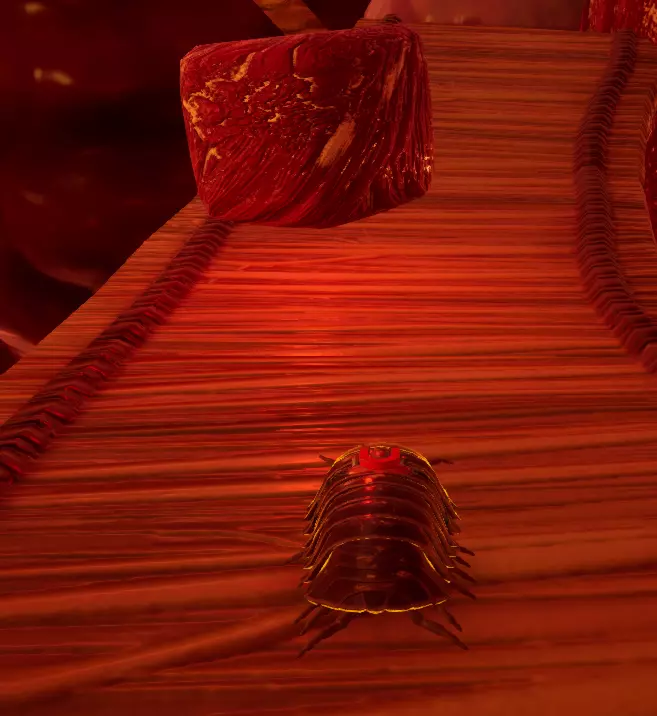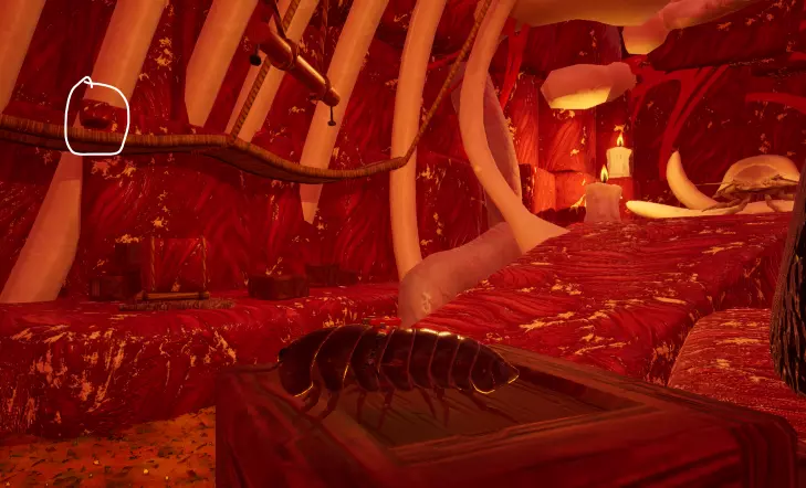 肉块立方体位于鲸鱼内脏尽头靠近大家伙的左侧。如果没有滑翔翼,要到达这里确实很麻烦,但我通过对着墙壁连续使用翻滚攻击成功上去了(注意不要把自己打下去,必须贴着墙壁才能向上)。如果用这种方法上不去,你也可以通过宇宙蛛网返回并带上滑翔翼再来。上交肉块立方体可解锁巨型深海皮肤。