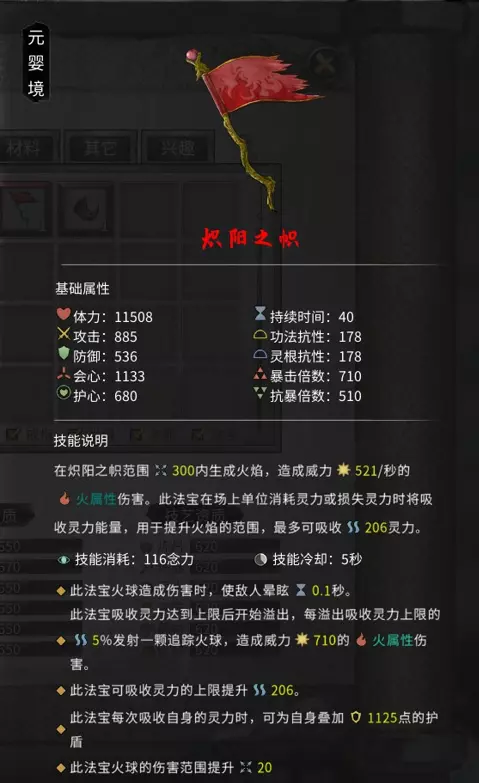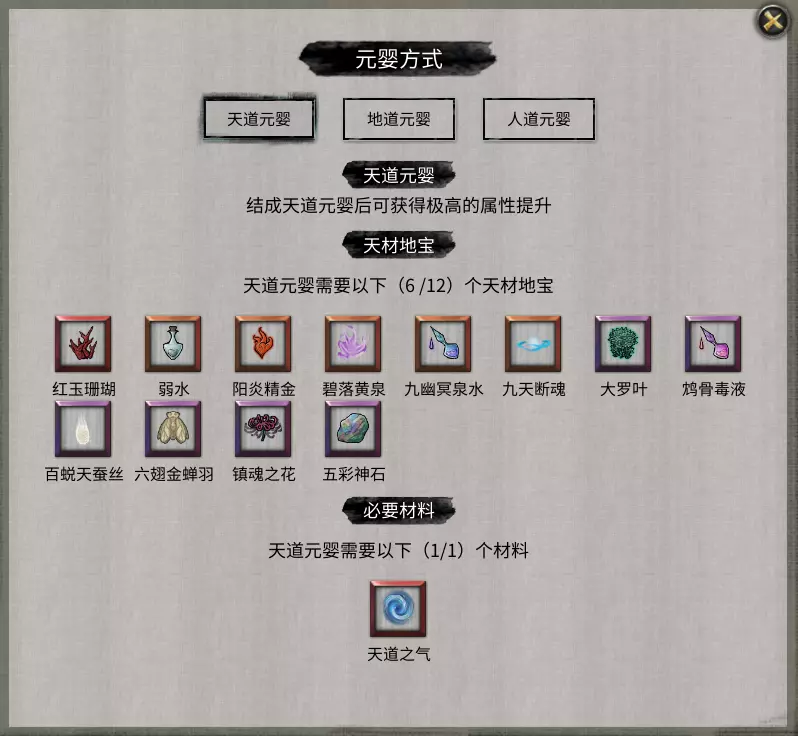 红玉珊瑚玩家可通过击杀十万大山的碎梦山挥获得,碎梦山挥的刷新会在每月刷新时通知玩家,其掉落几率为100%。 弱水、阳炎精金、碧落黄泉、九幽冥泉水、九天断魂,玩家可通过地图寻找到并需使用800念力进入【无极之境】中击破阵眼。击破阵眼后,玩家会获得一本【云陌州东(西)岳图】。注意:拿到东(西)岳图后,无极之境就会消失,之后在每月刷新时会随机在任何地点再生。玩家拿到东(西)岳图后需花费5000灵石使用,使用后地图会标明地点。玩家到达标明地点后,需使用右下角的【堪舆】(“堪”)来找到隐藏地点。建议存档之后再进入隐藏地点。因为你可能不想重复刷同一种天才地宝,所以使用存档读档大法是最省时的办法。人品不好的需要刷很多次,如果不用存档读档大法的话或者想刷秘籍就得多准备一些灵石和东岳图。击败副本里的大妖兽后副本消失。 天道之气玩家可通过在乾元界里击杀开明兽来获得。掉落几率100% 元婴境 对应区域:云陌州 当玩家踏入永恒冰原之后,李三将会出现并给予鬼谷密卷-本经阴符化神。玩家需要在包裹里使用,然后在玩家的突破界面会出现5个神魂槽。强烈建议想突破到化神境的玩家先把技能替换成橙色或者红色的元婴境技能然后才去挑战。玩家这时候需要凑齐五个神魂和一道化神之气。