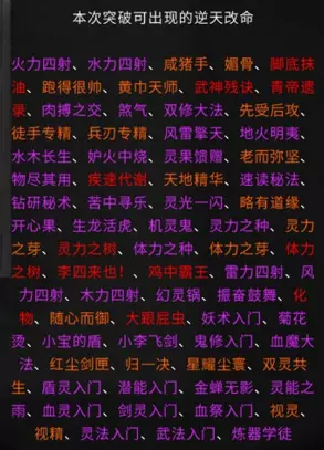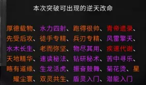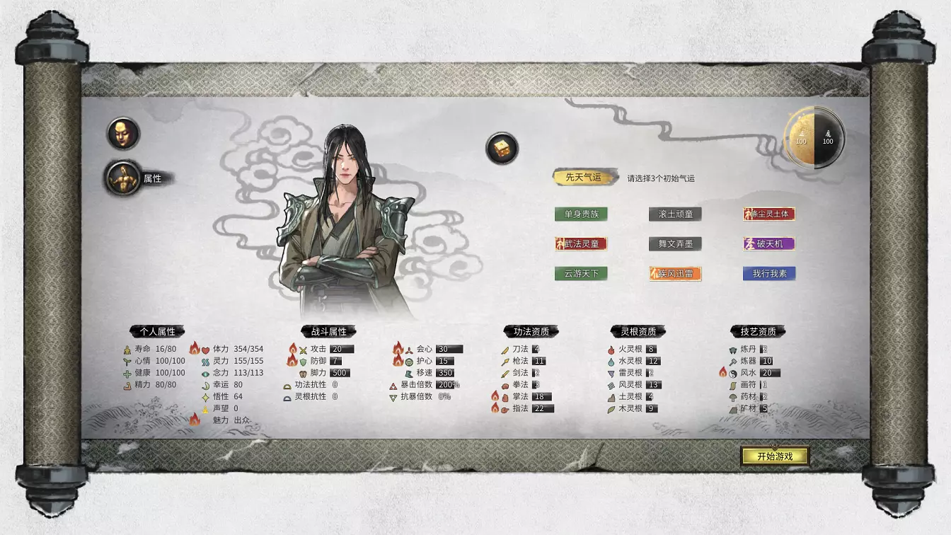 属性创建角色的第二部分较为重要。玩家需选择三个先天气运(初始气运),气运等级按颜色分为红色、橙色、紫色、蓝色、青色和灰色。部分气运需通过达成成就来获取。个人认为选择初始气运时,应优先选择悟性,其次是幸运。因为悟性会影响角色领悟秘笈的速度和秘籍参悟的点数,幸运则会影响掉落几率。其他属性基本都可后天弥补。