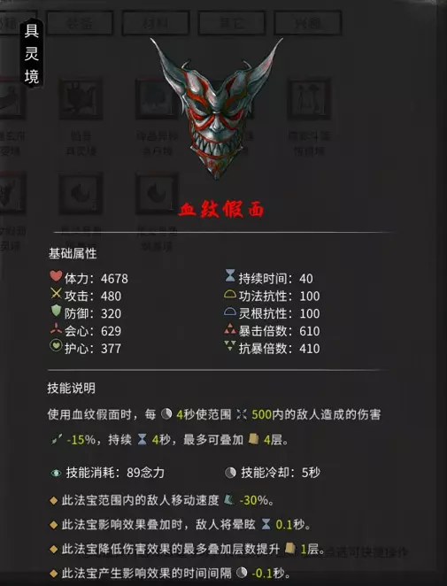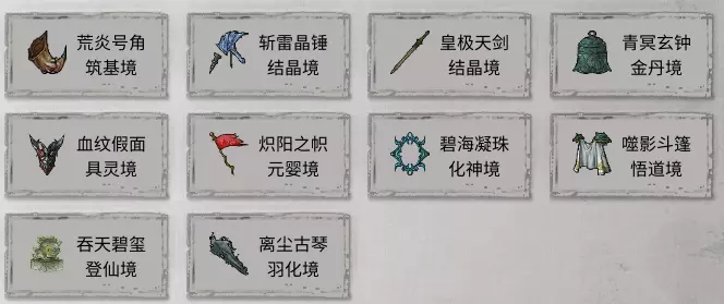 《鬼谷八荒》炼器系统介绍 法宝介绍:目前版本中可炼制的法宝共有8个,每个法宝对应不同境界。 法宝列表: 荒炎号角 斩雷晶锤 皇极天剑 青冥玄钟 血纹假面 炽阳之帜 碧海凝珠 噬影斗篷