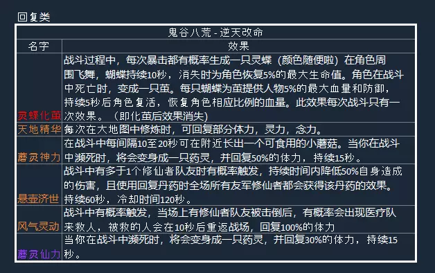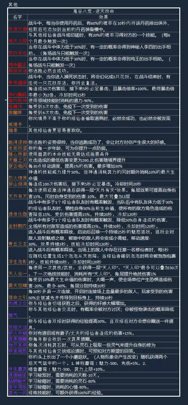 登仙境 登仙中期和后期登仙需要使用仙蕴丹来提升修为,仙蕴丹可以在仙盟【琅琊主阁】的秘宝页里购买。初期到后期需要大约40颗仙蕴丹。 初期到中期大概16颗,中期到后期大概22颗。 突破到中期:需打败【圣阳】和【冰夷】,就可获得【先天一气妖】。 突破到后期:需打败【后土】,就可获得【先天一气生】。仙人与地点: 永宁州 - 雷泽琼芳仙祠 - 紫姑 - 霓狸仙祠 - 梁渠和双双 华封州 - 十万大山止水仙祠 - 鹿林溪 - 月兰仙祠 - 瑶姬 云陌州 - 永恒冰原影弑仙祠 - 厉寒珊 - 天幻仙祠 - 东方茗雪 暮仙洲 - 迷途荒漠擎苍仙祠 - 蔽日仙菌 - 悬壶仙祠 - 风灵兰 - 离尘仙祠 - 帝江 赤幽州 - 斗魂仙祠 - 芦花王 - 烽岚仙祠 - 沧泷 - 缚命仙祠 - 季沽魂 - 神目仙祠 - 离珠 - 星主仙祠 - 苏墨白 - 昆吾仙祠 - 剑一 - 噬魂塔 天元山 - 破碎祭坛 本源仙力获得方法:突破到登仙中期和后期 仙祠任务 仙法获得方式:对话指的是寻求认可或闲聊。如果其一没有进展,请选另一个。 琼芳仙祠琼芳 紫姑第一次去不知道仙人名字。需要到擎苍仙祠与蔽日仙菌对话。这时候可以回到昆吾仙祠对话可获得仙法。 第二、第三次需要与仙人战斗,获得仙法。 第四次似乎需要成为八荒第一剑修,然后再挑战。 第五次挑战后获得仙法。 可以对话得知他想念月儿,需找到仙人【琼芳 紫姑】画一幅画。 去找【琼芳 紫姑】对话,需要20个石尘金。得到画后回去复命,可获得仙法。 破碎祭坛需完成【刑天舞干戚】的剧情后前往天元山。 激活全部8个石碑后破碎祭坛就会出现。 普通关卡有10个关卡,全部通关可获得全部仙法和一个【刑天的记忆】。 噬魂塔通过后可得仙法。 逆天改命与效果 以下为目前的版本中的逆天改命列表,逆天改命根据我个人的判断进行了分类。需要注意的是,并非所有逆天改命都会在炼气期供玩家选择,玩家可在选择逆天改命界面的右下角自行查看。 我将逆天改命分为成长类、属性类、回复类、攻击类、防御类和其他类型。 其中比较特殊的是成长类,成长类需要玩家先选择紫色的词条(若没有紫色则从橙色选择),然后在接下来的突破中选择橙色,最后达到红色。 如果你觉得部分描述不正确、等级(颜色)有误、遗漏了某些逆天改命或存在其他问题,请联系我,我会尽快修改。 注意:此列表中的伤害仅供参考,因为伤害会根据玩家的境界发生变化,所以部分伤害数值可能过低或过高。 版本:0.8.6015.259 此为最新增加的词条对话后得知仙人名为紫姑。 过后在12月与紫姑对话,她会要求你当她的模特。结束后获得本源仙力和仙法。 霓狸仙祠的梁渠和双双这两位仙人,先和梁渠对话得知他需要鱼纹瓶(兴趣物品)。 给了鱼纹瓶后他又要你找药灵。在任何一个城镇找到药灵然后打败他。之后直接进入剧情。 剧情之后他又要你钓鱼,钓了一桶鱼回来之后对话可获得仙法。 和双双对话得知需要通过考验(聊天)才可获得仙法。对话结束后获得负气运(健康-20,心情-10,精力-20)。第二次对话选择 我就多花了些时间 如听一席话 如隔一周 拥有了突破羽化和登仙的能力 前浪却被后浪推 很有鱼味 五年磨半剑 都是活的 说明我有一个宗门 说明我有一个仇人 被你恭喜了结束后获得本源仙力和仙法。 闲聊可得【八荒钓鱼全记】。 止水仙祠止水 鹿林溪进入之后对话发现仙人要出去玩。等遇到她再说。 之后会触发一个奇遇,在奇遇里与鹿婉瑜玩耍。要在规定时间内抓到她10次就可获得本源仙力和仙法。 月兰仙祠月兰 瑶姬进入对话后得知仙人需要你为她取得3种花。3种花分别有一个任务指引。 最为寒冷的地方:玄晶花 永恒冰原可以直接拿到。最多高山的地方:穆元花 十万大山打败大妖兽之后可以获得。 最多雷霆的地方:烁璃花 雷泽需要装备任何雷属性技能,即可得到。收集完之后回去复命就可获得本源仙力和仙法。 影弑仙祠影弑 厉寒珊 第一次进入后有一小段剧情。在原地跳过一个月后再次进入就会与仙人玩抽签游戏,需要拿到3支上签才可以得到仙法。 此时带上法宝,里面的器灵必须是厉凝霜。抽签3-4次必中,得到仙法。 天幻仙祠天幻 东方茗雪 第一和第二个仙法需要战胜仙人。 之后她会要求沐晴教她弹琴。需要一直装备着拥有沐晴的法宝才行。 每个月都有剧情。一年后,虽然茗雪还是没学会,但你还是获得仙法。如果已经完成了烽岚·沧泷的“想要听琴”任务,她会想暴揍你一顿。打败她可获得本源仙力和仙法。(与沧泷的任务重叠) 擎苍仙祠:进入擎苍·蔽日仙菌后,仙人会给你一个考验,需要击败一只药灵。击败之后回到仙祠与仙人战斗,胜利后获得仙法。 第二次进入会触发任务,需要到每一个仙祠道出仙菌的“伟大”复兴计划,和每一位仙人对话后回去复命,可获得仙法。 部分仙人会怀疑仙菌的计划(离珠、苏墨白、芦花王)。仙菌会被芦花王暴打,然后你会获得负气运。 之后直接闲聊并威胁他,可获得本源仙力和仙法。 悬壶仙祠:想办法让自己重伤,然后到悬壶·风灵兰仙祠找仙人医治。完成后点击【治疗】选项,此时仙人会交给你寻找【仁佑温神叶】的任务。找到并交给仙人后,原地等待一个月即可获得【本源仙力】和【仙法】。 【离尘仙祠】的【离尘 帝江】需要准备【上品紫电毛皮】、10个【坚兽骨】、30个【熊皮】、6个【尖锐的兽爪】和2个【碎布片】交给他。之后他会变成一只