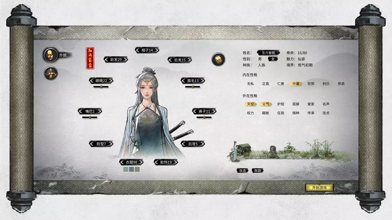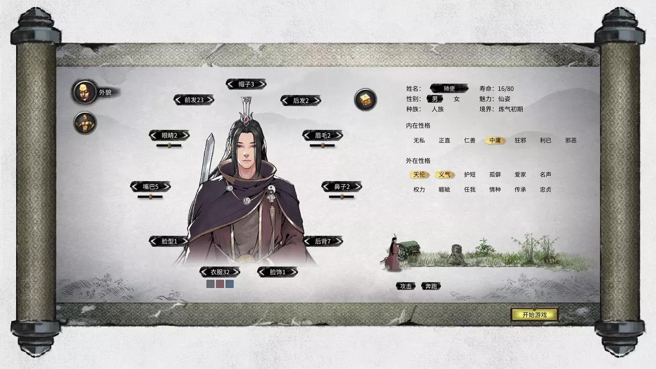 角色创建与属性 创建角色主要分为两个部分,第一部分主要是命名、捏脸和选择性格,第二部分就是选择先天气运。 外貌方面需要注意,捏脸会影响角色的魅力值!所以如果很注重魅力值,就要谨慎捏脸。目前已知的魅力阶段可分为丑陋、怪异、普通、出众、超凡、仙姿。当然也可以自由捏脸后通过先天气运(如倾国倾城之类)来达到仙姿,但并不推荐这种方式。 以下提供的参考只是众多选择中的一个,玩家可自行调整。 男