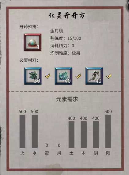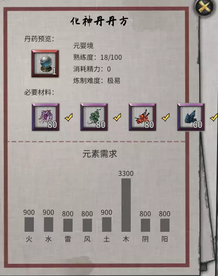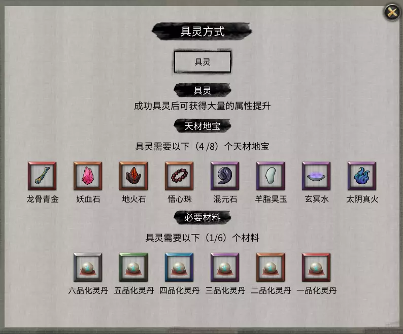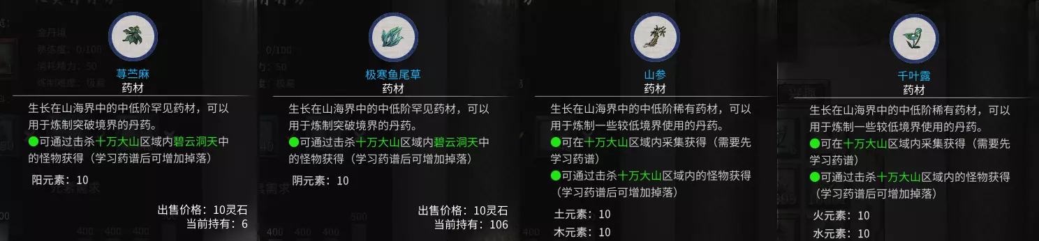 【龙骨青金】玩家击杀出现在十万大山下方的【苍魂鸣蛇】后即可获得。 【妖血石】【地火石】【悟心珠】:玩家解决何罗鱼事件后,便可前往十万大山。在十万大山中,玩家需寻找三座残破封魔阵,每座残破封魔阵需要五个四品灵果,总共需要15个四品灵果。进入之前强烈建议先存档,每座残破封魔阵初次破关可获得随机一个天才地宝。 【化灵丹】:除天才地宝外,玩家还需自行炼制一枚化灵丹。炼制化灵丹需要收集三味主药、火元素药材和水元素药材。个人推荐【千叶露】,因其本身兼具火与水元素,且在华封州玩家能入手的丹炉通常只有四个材料槽(部分丹炉会附带增加材料槽的效果)。需要注意的是有两味主药需要在【碧云洞天】获取。
