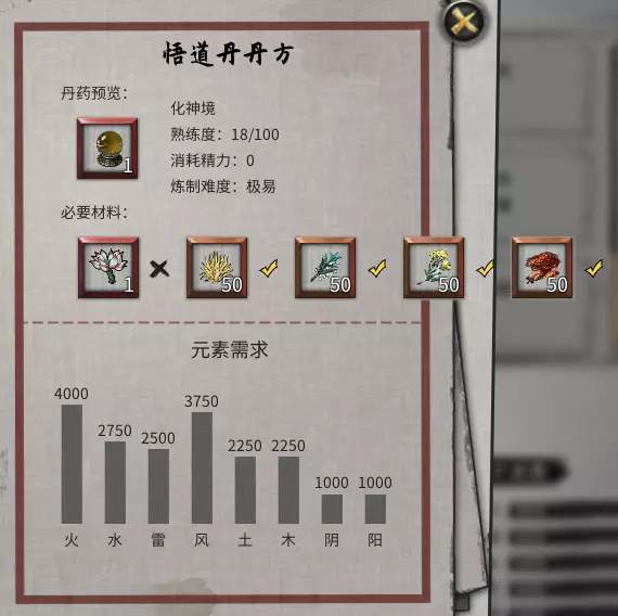 悟道丹所需药材有天桂枝、天葵鸟尾草、过江水虞草、无踪箭头风以及火灵血芝。