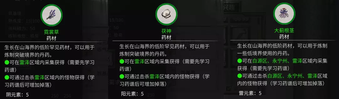 当玩家到达筑基期后,在地图南方的雷泽区域,每月刷新时会提示炼狱当康出没。玩家需穿越雷泽,前往妖兽所在地将其击杀,即可获得【夕颜】。建议与玄灵秘境一并刷取,且前往前可在任意永宁州坊市购买传送符。 【绮罗幽香】、【鬼哭藤】、【北冥摄魂】需玩家进入玄灵秘境(开启需消耗1000灵石)击杀BOSS获取。需要注意的是,永宁州仅有两处玄灵秘境,剩余一处需在雷泽内寻找。建议与炼狱当康一并刷取,前往前可在任意永宁州坊市购买传送符。 【化晶丹】可由玩家自行炼制或从宗门换取。炼制化晶丹的必要材料为【霓裳草】和【茯神】。这两样材料需要玩家在雷泽中击杀妖怪掉落。收集所需材料需要一定时间,建议先到小镇或城里购买相关药谱并使用(使用药谱需要一定的药材资质,可通过击杀药灵获得)。角色的幸运属性也会影响材料的掉落率。若玩家想要炼制一品化晶丹,还需雷元素药材大蓟根茎,该药材同样可在雷泽收集齐全。之后建议在宗门换取丹炉来炼制丹药。