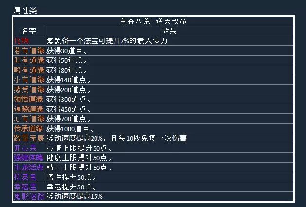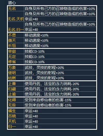 从上述列表看来,虽然有些道心的附加属性是一样的,但是它们主要的区别在于能解锁的逆天改命。 下面的逆天改命列表可以供大家参考: 【无名】自身及所有己方的召唤物造成的伤害+10%