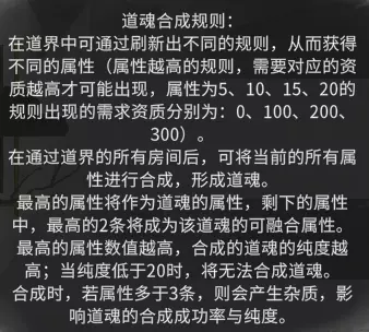 道魂玩家可在枪木道界、刀指道界、雷拳道界、剑水道界、风火道界、掌土道界中获取任意属性的道魂,但在道界内只能获得对应的道界石。因此,玩家在决定刷道魂前,强烈建议先刷取每种道界石数千颗。玩家可在第一个房间的传送阵出现后离开(注意:若遇到某种道界石无法刷出的情况,重开游戏即可恢复正常)。 当玩家拥有一定数量(建议数千颗)的道界石后,便可前往任意道界刷取道魂。需要注意的是,若想获得纯度100%的道魂,道魂只能包含三种属性。若玩家想更换流派,可导出存档以便日后换流派使用。最后,玩家需刷出三道纯度100%的道魂(最好三个道魂的主属性相同)。