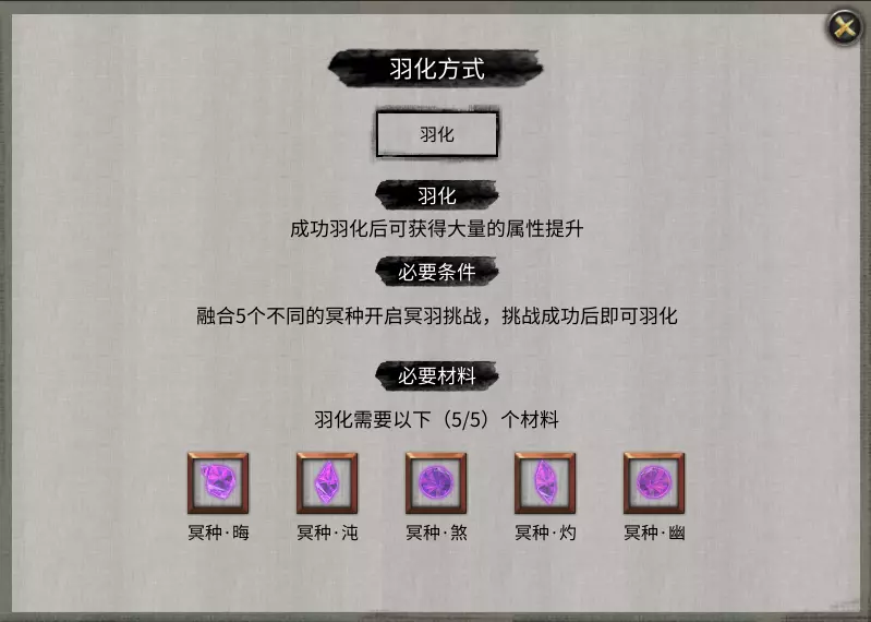 云陌州魅谷: 到达后需防御兽潮一分钟,且妖兽数量不可超过50。成功后冥窟会生成,前往冥窟即可获得冥种与秘籍。 慕仙洲玉髓冰宫: 冰宫会时刻移动,需一直跟随任务指示前进。遇见冰宫后会触发一段小剧情,随后冥窟生成。玩家需要防御识海,成功后可获得冥种与秘籍。 赤幽州寂寞沙洲: 找到地点后触发一小段剧情,即可获得阳炎精金。之后将阳炎精金丢入汞源,冥窟就会生成。进入冥窟后可获得冥种与秘籍。 当集齐5个冥种后即可突破,突破时可选择5种神兽之一,选择哪种神兽合适因人而异。羽化境 羽化初期、中期、后期这三个小境界的突破不再需要购买丹药,而是改为收集素材。其中,突破至中期需要10个混沌之息,突破至后期需要5个上品混沌之息。 羽化境中期:需收集10个混沌之息,可通过大地图副本获取。集齐10个后即可开始突破,玩家需防守识海,击杀冥种后获得混沌灵息。 羽化境后期:需收集5个上品混沌之息,可通过大地图副本获取。集齐5个后即可开始突破,玩家需防守识海,击杀冥种后获得清净灵息。 副本指的是突破登仙境的副本。