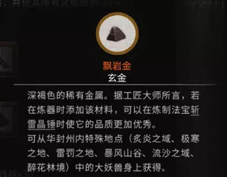 稀有材料:飘岩金 x10 获取方法:击杀华封州内的大妖兽获得