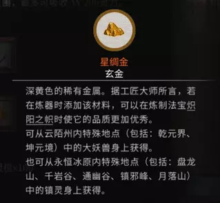 稀有材料:星绸金 x10 获取方法:击杀云陌州内的大妖兽(乾元界,坤元界)后获得,或从永恒冰原里的盘龙山、千岩谷、通幽谷、镇邪峰、月落山中的镇灵身上获得。