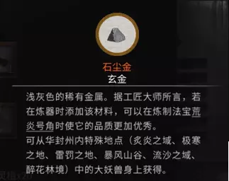 稀有材料:石尘金 x10 获取方法:击杀华封州内的炙炎之域、极寒之地、雷罚之域、暴风山谷、流沙之域和醉花林境中的大妖兽获得