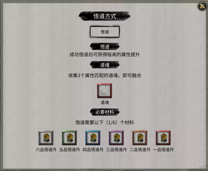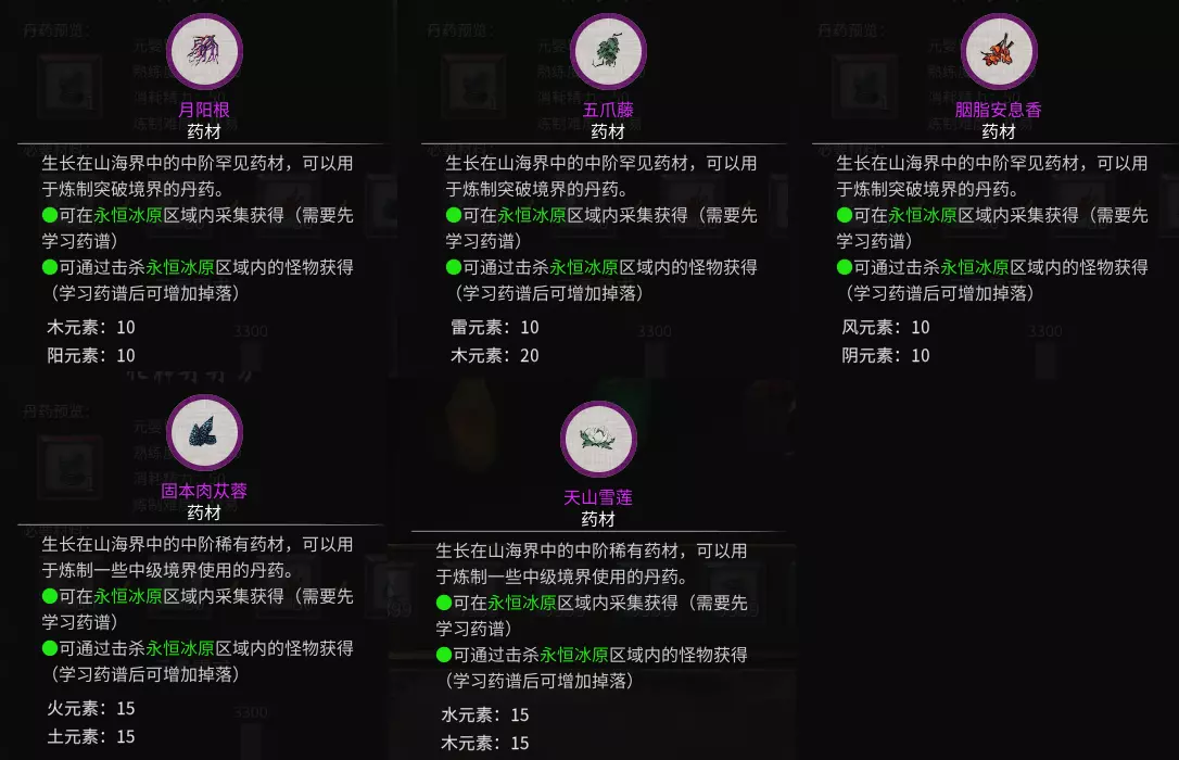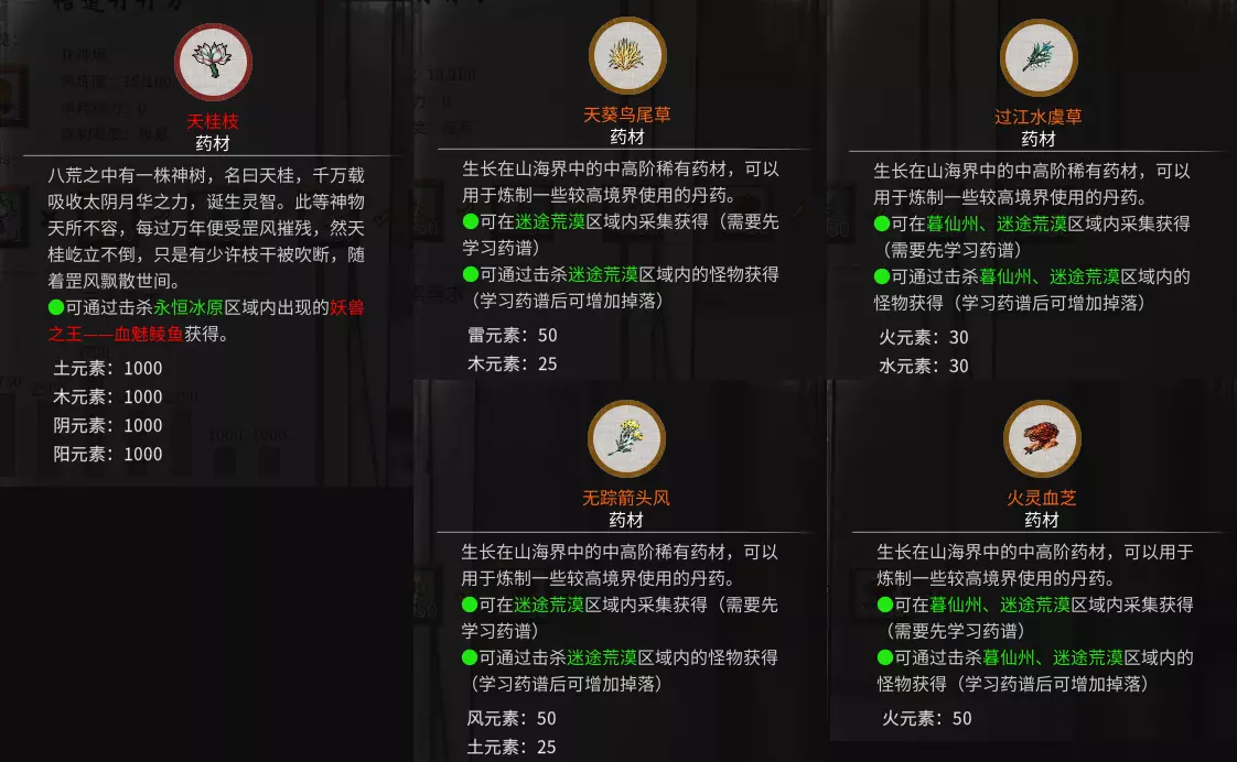 天桂枝玩家在永恒冰原击杀血魅鲮鱼即可获得。血魅鲮鱼会在每月刷新时出现并通知玩家。 天葵鸟尾草、过江水虞草、无踪箭头风与火灵血芝可在迷途荒漠的小妖身上掉落。其中过江水虞草和火灵血芝也可在暮仙州的小妖身上掉落。 悟道境 对应区域:暮仙州