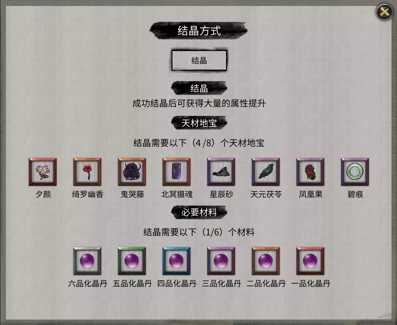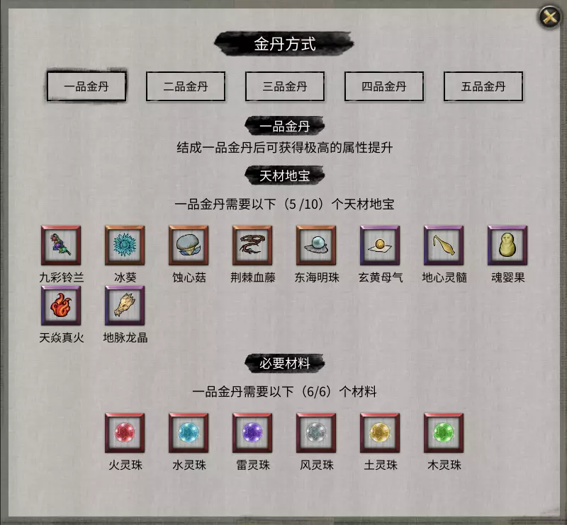 结晶境 对应区域:华封州 一旦玩家到达结晶境就得离开永宁州,来到华封州。结晶境突破到金丹境的方法与突破到结晶境的方法有所区别。金丹境共分为一到五品,其中一品最佳但突破过程也最为繁琐。在此仅讲解突破到一品金丹所需的材料,包括五样天才地宝和六属性灵珠(注意:不是六属性灵气!)。