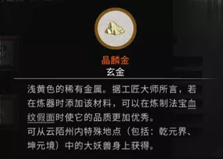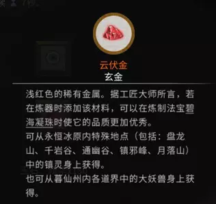 稀有材料:云伏金 x10 获取方法:击杀暮仙州内道界中的大妖兽获得,或从永恒冰原里的盘龙山、千岩谷、通幽谷、镇邪峰、月落山中的镇灵身上获得。