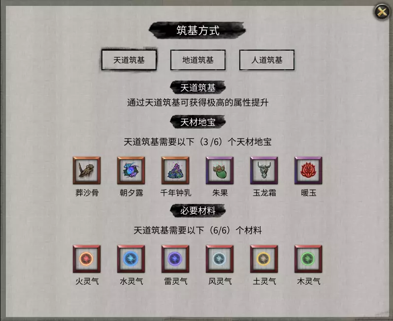 游玩建议 每到一个全新的区域,推荐先把地图探索完毕。玩家可以一边探索一边修炼(暂且不谈高难度)。 每当想要刷药材的时候,记得先把药谱学起来(能收集全部最好)。 药谱和风水书可以在州内的五小镇和主城里的坊市找到,玩家需要到达每个小镇和主城购买才能收集全部。 每当丹魔、药灵和血傀出现时,尽快前往所说地点(都在小镇/主城/宗门附近)把他们击败。你需要他们掉落的通论道典来提升炼丹、风水和药材资质。玩家需要这些资质来学习风水书、丹方和药谱。 每当突破到下一个境界,建议到对应区域的主城购买上品戒指和坐骑。 尽量参加拍卖会以了解价格。尽量多参加升仙台以提升道点。 多交道友和论道以增加道点。魅力高的话,很多人想与你双修(待确认)。 多留意功法需要的条件,别选了看似不错的神通结果没办法触发。 境界介绍 每道境界可以细分为前期、中期和后期。从前期迈入中期,中期迈入后期我称之为小突破。每次的小突破都会带来一些属性的提升。每个境界的小突破需要玩家通过积攒修为到所需的量,然后到城/小镇购买丹药来进行突破(羽化、登仙除外)。获得修为的方法: 1. 在大地图点击右下角的【修】进行修炼,选择灵气充沛的地点效果最佳。 2. 门派内的聚灵阵。 3. 双修。 4. 使用月精魂丹(通过奇遇获得)。 5. 完成奇遇。 6. 使用仙蕴丹(登仙境使用)。 当修为提升至后期瓶颈时,玩家需收集各种材料以突破至相应境界。不同境界所需材料及获取方式均有差异(游戏前期差异较小)。 以下境界划分均以玩家当前境界为准,而非即将突破的境界: 炼气境 所在区域:永宁州 玩家到达永宁州后,主线剧情【后羿射日】将开始引导。此处不详细讲解剧情,因玩家基本不会跟丢剧情,后续若有需要将补充剧情介绍。从炼气境突破到筑基境,玩家可以选择人道、地道和天道筑基。天道筑基提供的属性提升最佳,建议选择天道筑基,且后续所有境界均建议追求最优突破效果。天道筑基需玩家收集三样天才地宝和六属性的灵气。