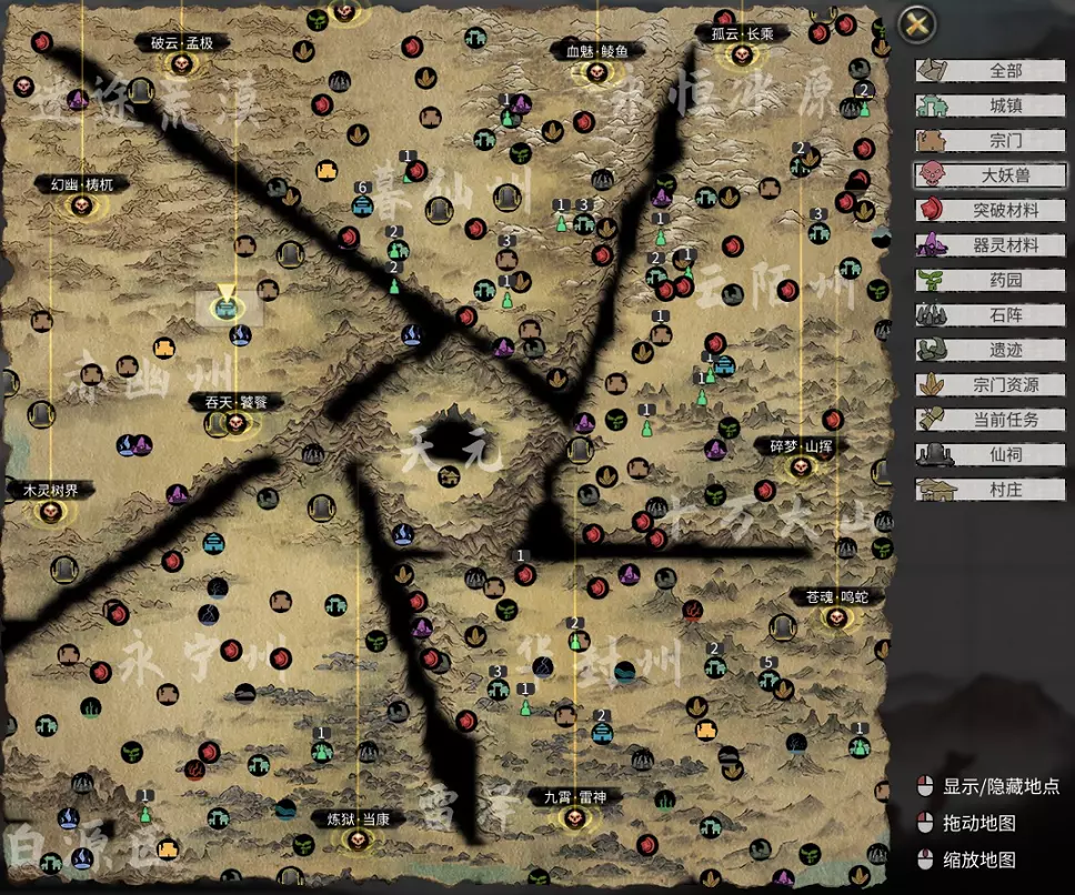 永久性提升属性的方法: 个人属性 寿命:突破,灵果(人面果,延寿丹) 体力:突破,技能 灵力:突破,技能 念力:突破,技能 幸运:逆天改命,道心 悟性:逆天改命 声望:通过达成悬赏任务、门派任务、奇遇获得 魅力:坐骑 战斗属性 攻击:突破,技能 防御:突破,技能 脚力:坐骑 功法抗性:技能 灵根抗性:技能 会心:突破,技能 护心:突破,技能 移速:突破,技能 暴击指数:突破 抗暴指数:突破 *技能包括武技/灵技、绝技、身法、心法、神通 功法、灵根属性通过灵果进行提升,灵果可通过击败首领、门派兑换、奇遇获得。技艺属性可通过每月刷新的丹魔、血傀、药灵、石灵获取,也可进行兑换。 地图 目前游戏开放的地图中,每个地区对应不同境界,具体如下: 白源区:新手教程 永宁州、雷泽:炼气境、筑基境 华封州、十万大山:结晶境、金丹境 云陌州、永恒冰原:具灵境、元婴境 暮仙州、迷途荒漠:化神境、悟道境 赤幽州:羽化境、登仙境 天元:登仙境 注:地图中的地点均为随机生成,此地图仅供参考。