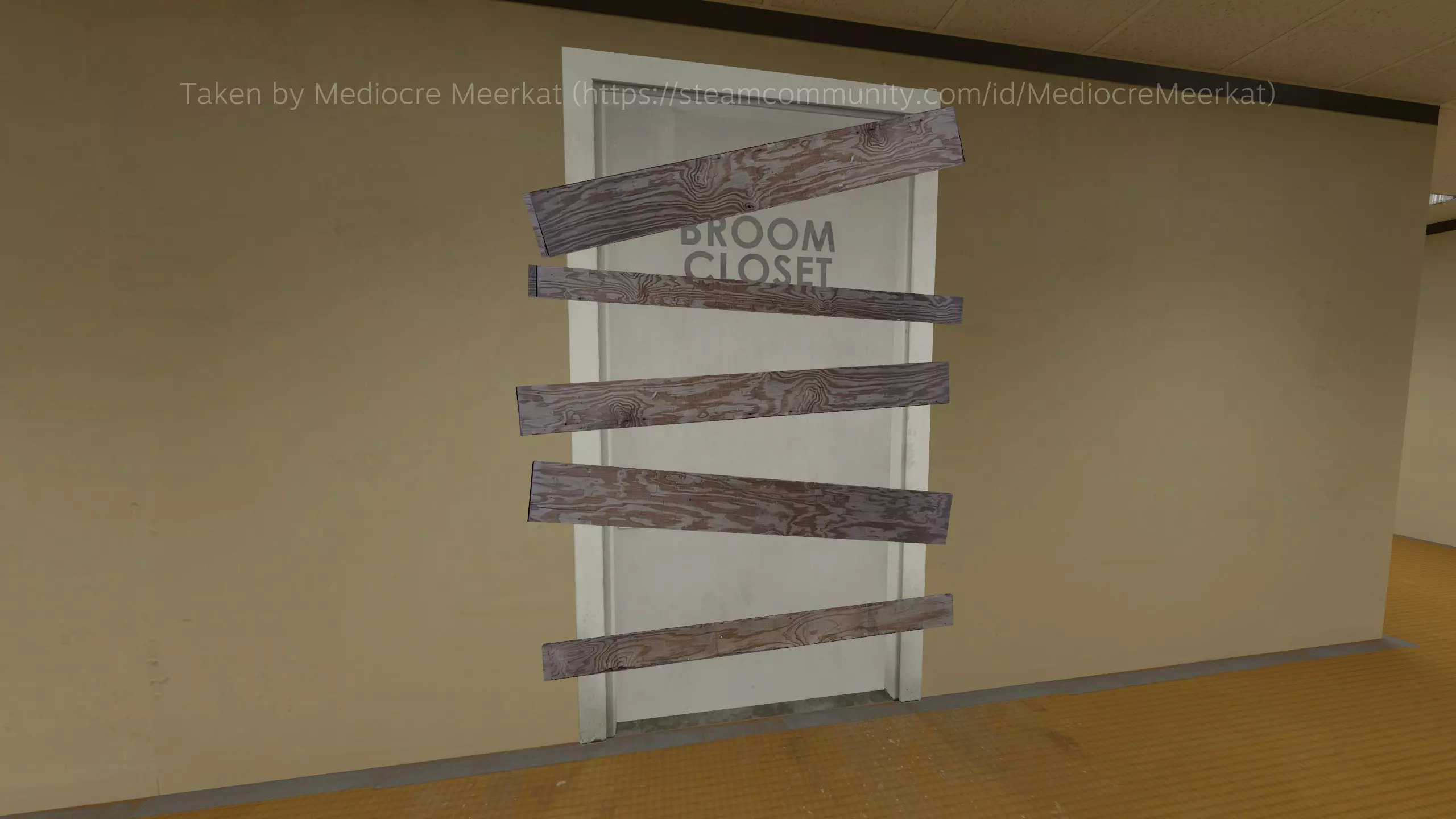 在第五次时,游戏会开始评论时间与知识的意义,然后告诉你它会再次与你相见。 完成尾声后,每次打开游戏你都可以选择新的副标题,并且数字会递增(哦,多 fancy 的词啊。看来有人在计算机课上很认真听讲嘛) 趣味秘密 扫帚间 在两扇门处,选择左边的门。离开会议室后,进入扫帚间。 初始情况 旁白最终会等待新玩家接替你,因为他认为你已经“死亡”。当这种情况发生后,你需要离开房间再重新进入。 如果你在重复游玩时持续进入这个扫帚间,它最终会被木板封起来。