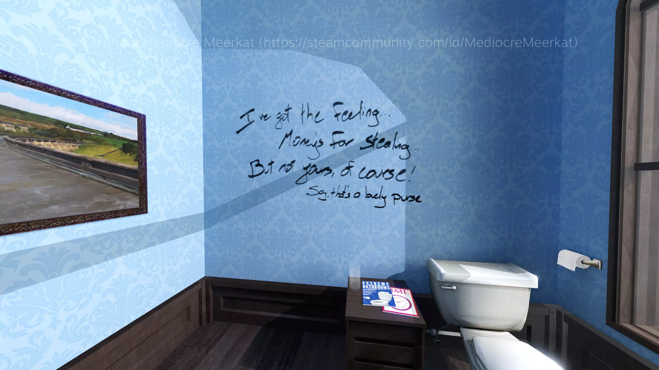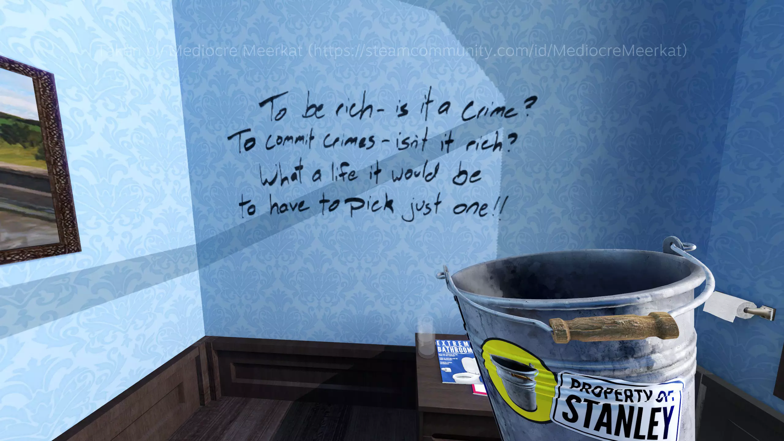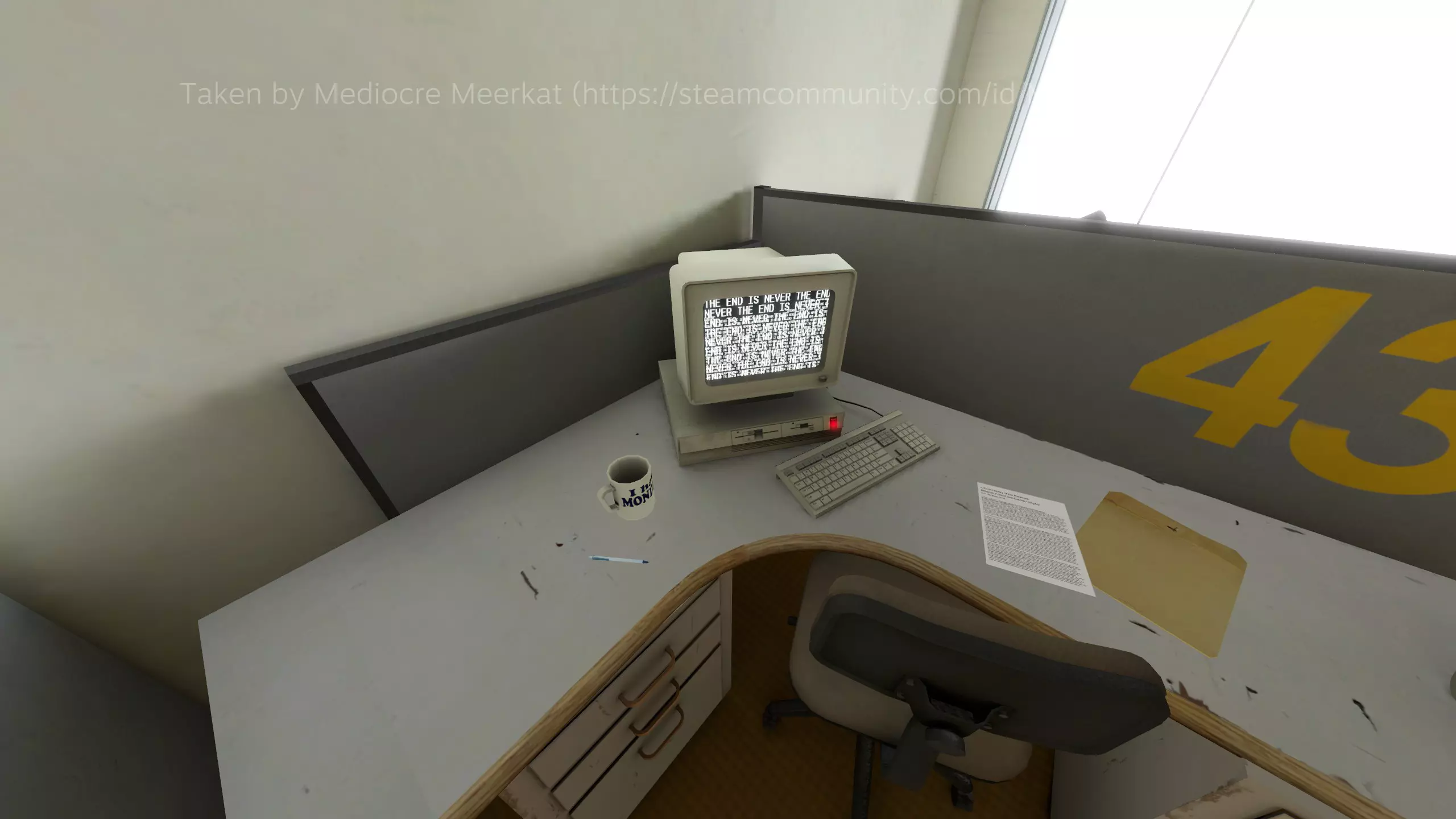 变得富有——这算是一种罪吗? 犯下罪行——难道不算是一种富有吗? 要是只能选其一,那生活该是何等模样! 神秘男子(暂定名,有待完善)我在评论区和讨论论坛里听到了一些风声(还有喘着粗气的留言),据说有人看到一个男人在多个不同的地方走动,或者盯着玩家看。我自己还没见过,所以无法证实或否认,但如果有特定的触发方法,请告诉我,我会尽力在这里记录下来。 其他 你可以通过关闭走廊两端的门来触发一些对话,这条走廊里有办公室编号。417 在尾声部分,其中一个【交谈】按钮显示的是“斯坦利”而非“吉姆”。 在监控室,你可以通过按下第二个按钮后迅速后退,让自己卡在第一个和第二个按钮之间的过道上。这没什么实际作用,但还挺有趣的。 如果你多次到达老板办公室里的秘密电梯,旁白会立即为你打开它(这似乎也会缩短电梯行程,但我可能记错了)。 结论 就像我目前拖延的所有论文一样,每一篇好文章都有一个好的结论。虽然我不会称这篇为好文章,但为了满足我的 ego,我当然想假装它是…… 总之,感谢你阅读我的指南!我不会在这里宣传任何其他内容,因为我不是为了博取网络点数,所以结论部分实在没什么好说的了……呃……再见?祝你今天愉快?大概是这样吧?行…… ——MediocreMeerkat 附:对了……跟大家说个有趣的事。这份指南在未经我允许的情况下被多个网站转载,其中大多数甚至都不注明出处(有一个网站写的作者是“Mediocre”,说实话这算是个挺中肯的侮辱了)。我不确定该怎么解决这个问题,但还好啦,一切都好。我一点都不生气。