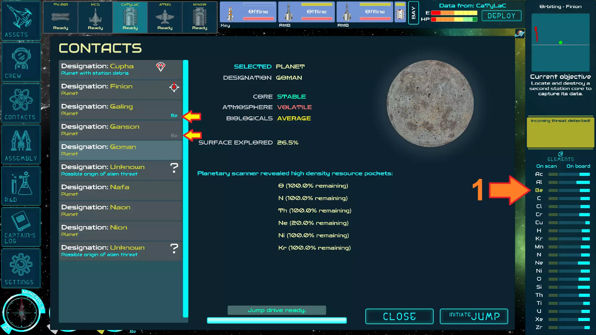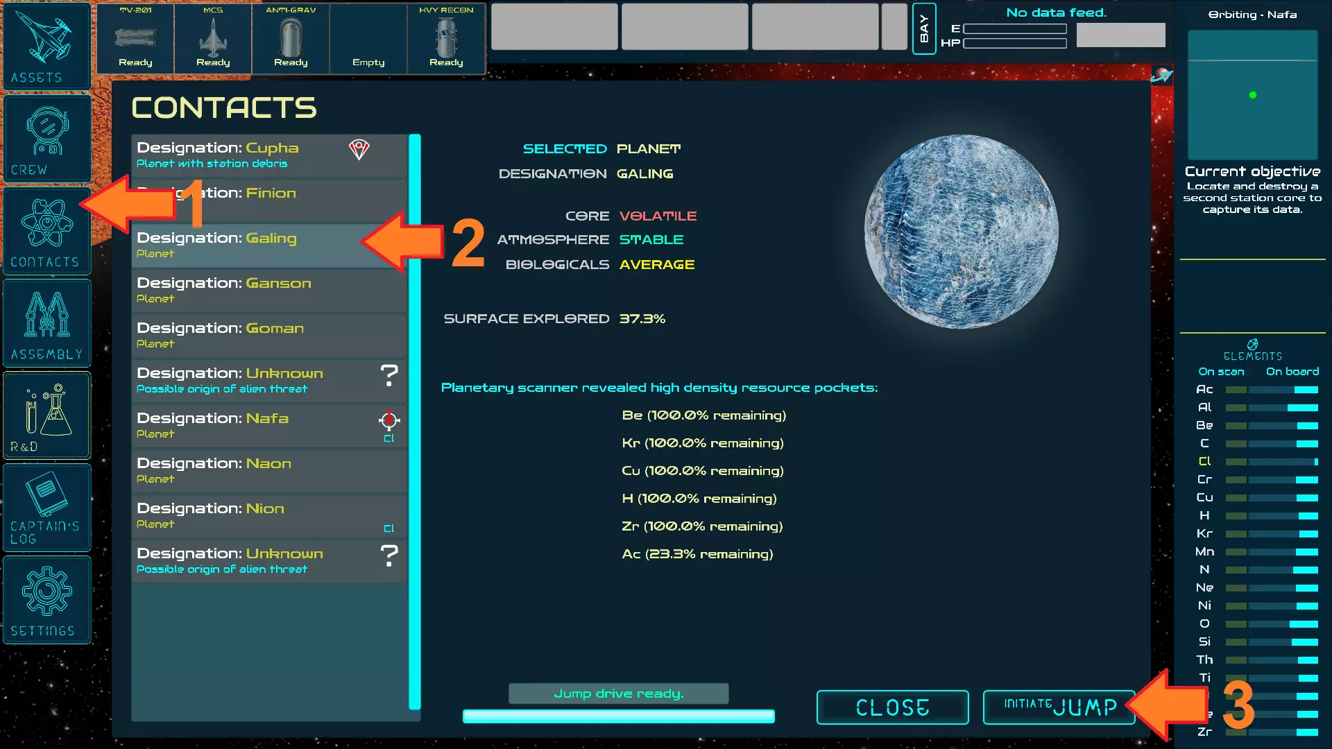 如果在某颗星球上探测到元素,该元素会显示在该星球的联系人列表中。当身处星球上时,追踪器会指向包含所选元素的资源点。
