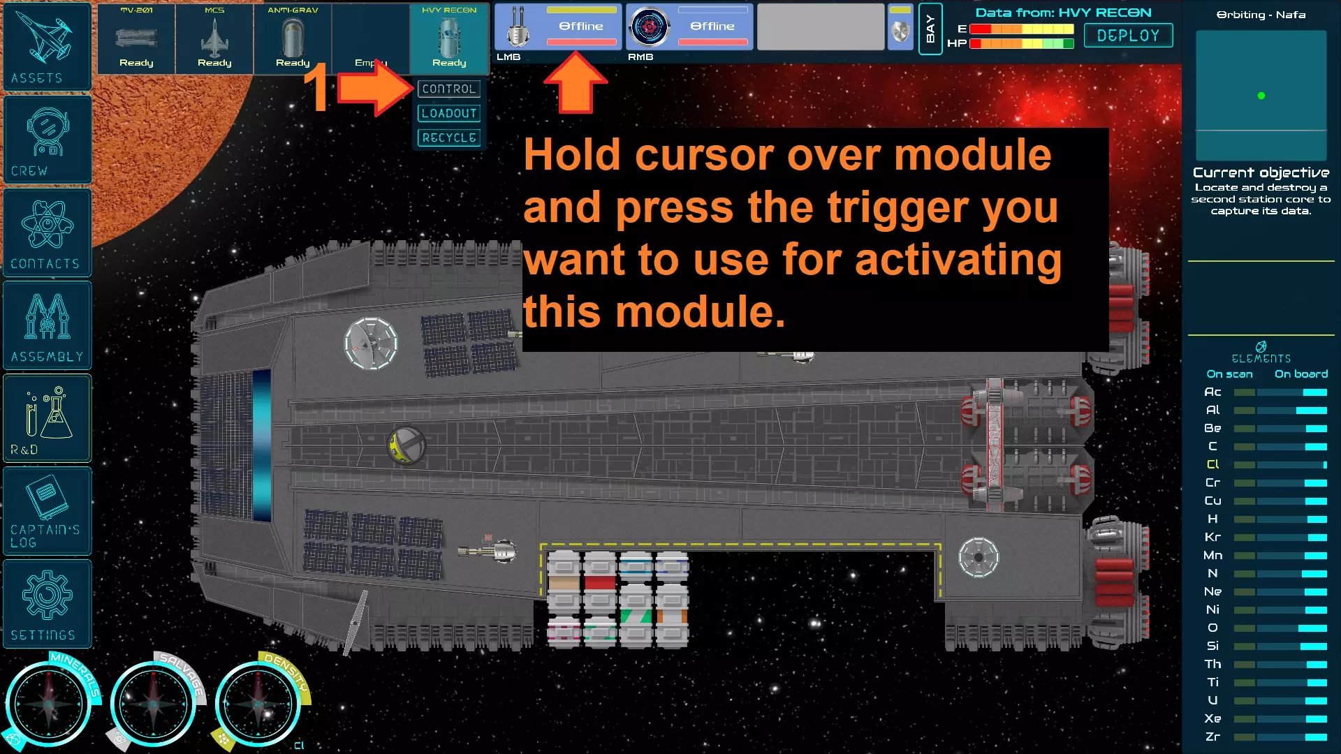 要清除搜索,再次点击同一元素即可。追踪器现在会指向最近的高密度元素区域。 元素保存方法 修理总是会消耗一些元素。在更高难度下,你会受到更多伤害,因此元素可能会很快耗尽。 你可以回收任何资产,包括其上已安装的模块,以回收用于建造它的元素。建造的全部成本将始终返还。 修理机器人可以成为飞船的一个非常有用的附加装置。通过减少飞船受到的伤害,可以大幅降低修理成本,从而保存更多元素。 模块激活按键配置 有些模块需要单击鼠标(或按键),而另一些则需要按住按钮(或按键)。要设置激活模块的触发键,首先选择你想要控制的载具。将鼠标光标悬停在顶部数据栏中显示的已安装模块上。 保持光标悬停在模块上,然后按下你想要用于激活该模块的触发键。鼠标左键、鼠标右键、空格键和小键盘0键都可以用作触发键。所选的触发键会始终与模块的其他信息一同显示。
