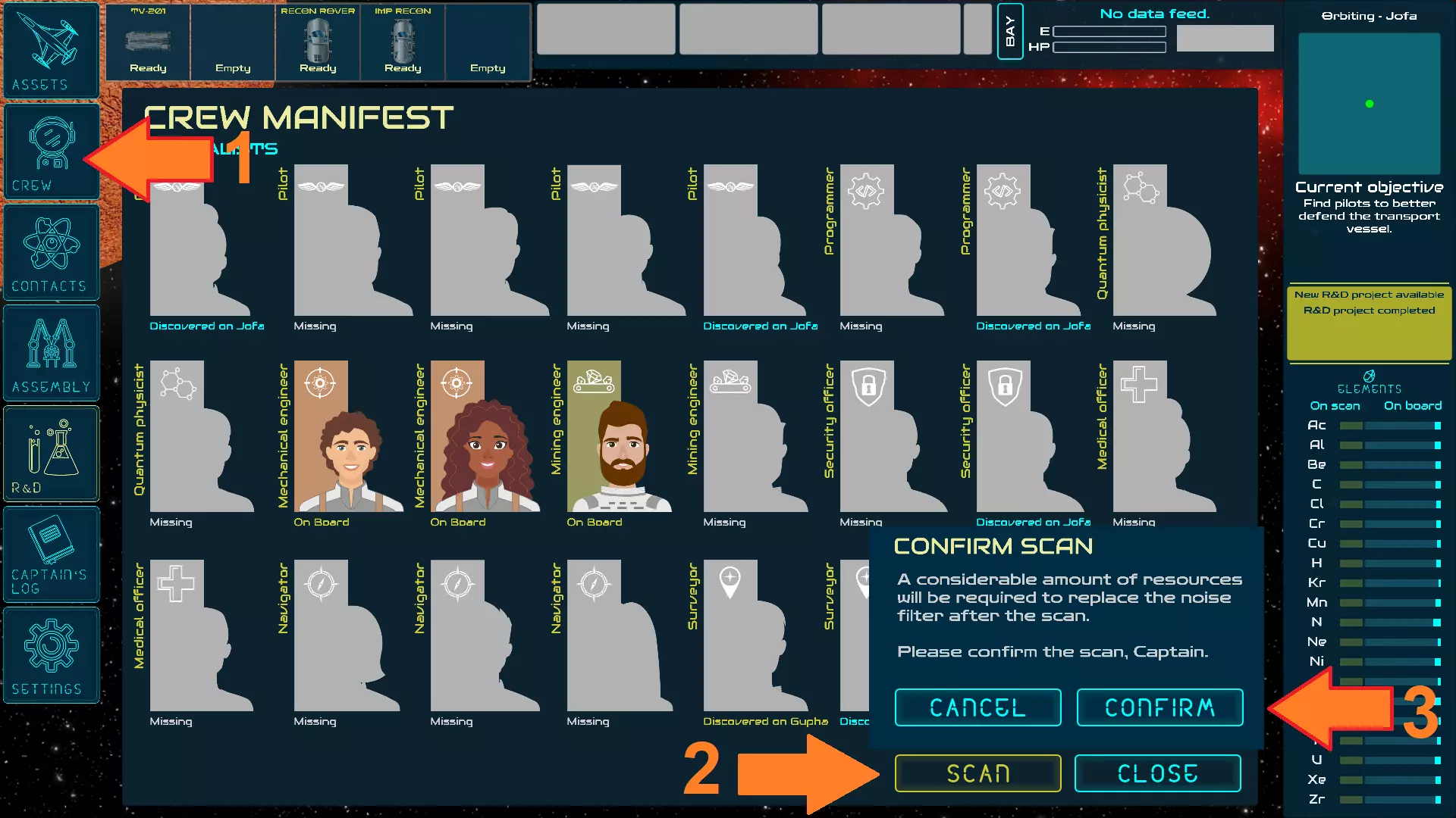 造成伤害 最基本的造成伤害方式是撞击。你可以撞击敌人和矿物露头来对它们造成伤害。游戏开始时,基础武器就已可供研究。优先进行这项研究以及改进型漫游车的研究,以便尽早获得武器化登陆载具。 提示: 在召回过程中,载具必须保持静止才能让运输机进行拾取,但只要登陆载具还有剩余能量,武器在召回期间仍然可以使用。你可以通过向敌人开火来阻止它们靠近。 新技术 记得在新技术可用时进行研究,以获得更好的登陆载具、航天器、武器和支援模块。组装这些物品中的任何一种都需要消耗一定数量的元素。更高等级的登陆载具通常具有不同的操控方式,并且拥有更高的生命值、能量储备和模块安装位,能够实现更多武器与支援模块的组合搭配。航天器亦是如此。 元素收集 敌人会掉落你当前拥有量最少的元素,以此作为击杀敌人的奖励。 矿物露头和 salvage 总能提供多种随机元素。 你还可以在高密度资源矿脉上方使用采矿钻,开采其中包含的特定元素。 提示: 两个 salvage 通常能提供足够资源来建造一辆改进型漫游车。研究内部货舱并将其安装到你的登陆艇上,这样可以显著增加你每次降落到星球时能够收集的元素数量。 在每个星球上,你会发现3块较大的矿物岩石。它们能让你收集到比平时多得多的元素。 矿物短缺机制: 在简单和困难难度下,会启用一个额外的游戏机制。时不时会出现一种或多种特定元素的矿物短缺情况。要永久消除某一特定元素的矿物短缺,唯一的方法是钻探高密度资源矿脉,直到其开采量至少达到50%。 小贴士: 钻探期间登陆载具会保持静止,因此最好使用能够装备多个采矿模块的登陆载具。装备第二个提供防护的模块。 尽快研发改进型和高级钻探设备以加快采矿进程。 高密度资源矿脉 一旦研发出地球化学采样器,你就能轻松探测到高密度资源矿脉。它们位于地下,无法直接看见,但一旦被发现,其位置会在雷达上以黄色圆点标记。在联系人列表中选择行星时显示的行星摘要中也会列出这些矿脉。安装采矿钻头并在矿脉上方进行开采,即可获取矿脉中包含的元素。提示: 你可以通过三种方式发现资源矿脉: 1. 在其上方进行采矿时,通过探测发现(雷达上的点表示矿脉中心,但实际上它的半径要大得多)。 2. 研究地球化学采样器,并进入星球上矿脉的范围内。 3. 研究并组装行星扫描仪。当运输船在行星轨道上时,它会扫描整个星球并显示所有矿脉。 船员收集 不要忘记寻找并收集你失踪的船员。不同的专家会解锁不同的研究选项。其中一些对完成游戏也至关重要。 研究船员推断是在游戏初期确定船员位置的简便方法。它会显示哪些船员可以在星球上找到。当前正在绕行的星球上可找到的船员,会在【船员】标签页中高亮显示。 虽然会消耗一些元素,但你也可以通过研究并组装远程心跳扫描仪来精确定位星球上船员的位置。使用扫描仪的方法是:进入【船员】标签页,在可用时点击【扫描】按钮,然后点击【确认】执行扫描。 你可以在不收集所有船员的情况下完成游戏,但只有在游戏结束时集齐所有船员,才能解锁成就Leave no man behind。