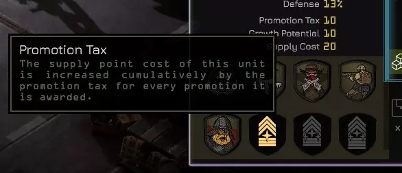 5) 晋升 晋升小队队长会增加将其带入战斗的补给成本。暂缓晋升,转而通过黑市招募更多小队队长/飞行员可能更具战术性,这样可以让你携带更多载具/队员,从而获得更强的火力。 每位队长都拥有一些仅属于他们的【独特晋升】,同时还有一些其他所有队长都可使用的通用晋升。