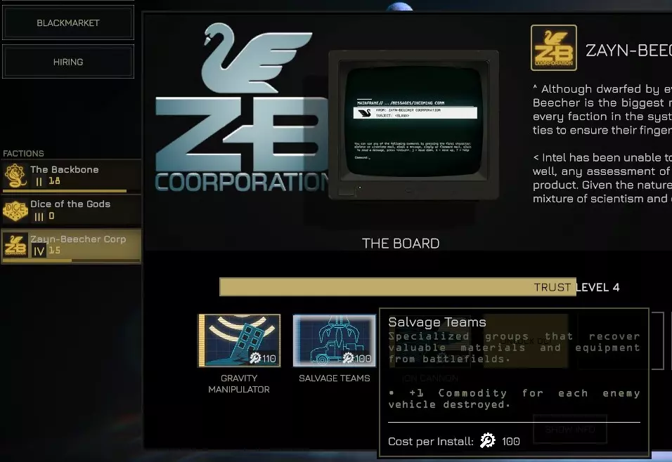 18) 打捞小队O.C.I.是黑市交易物资的良好来源 拥有此O.C.I.后,每摧毁一辆载具将为你提供价值20黑市币的物品。在多个任务过程中,尤其是在海盗任务中,你可以轻松积累数百的交易价值,因为他们部署了大量的武器卡车和车载步兵。 注意,地图上的中立/装饰性载具不会掉落打捞物,但已让步兵下车的敌方空卡车会掉落。 你可以通过将Zayn-Beecher Corp.的等级提升至2级来获得它。