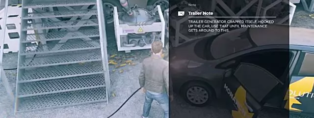 看完预告片后,你可以跑进一个有破旧船只的车库。跑到车库角落里那个大型黄色储罐的后面,就能找到这个信源。叙事物品7