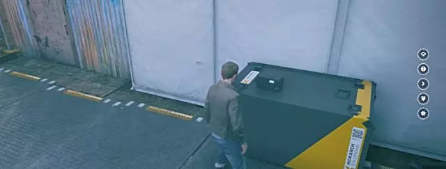 在仓库建筑之间的小巷里,有一扇锁着的门,墙上喷涂着大型黄色涂鸦生物图案作为标记。跳上附近的垃圾桶,就能登上屋顶。目标物就漂浮在你起跳位置的正上方。 叙事物品8:莫纳克内部通讯2(音频文件)