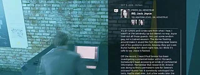 转身查看你的伙伴已开启的电脑屏幕并观看视频,即可获得这个收集品——视频中显示的内容会根据你在第一章节点部分选择的选项以及谁仍然存活而发生变化。 叙事物品7:RE杰克·乔伊斯(电子邮件)