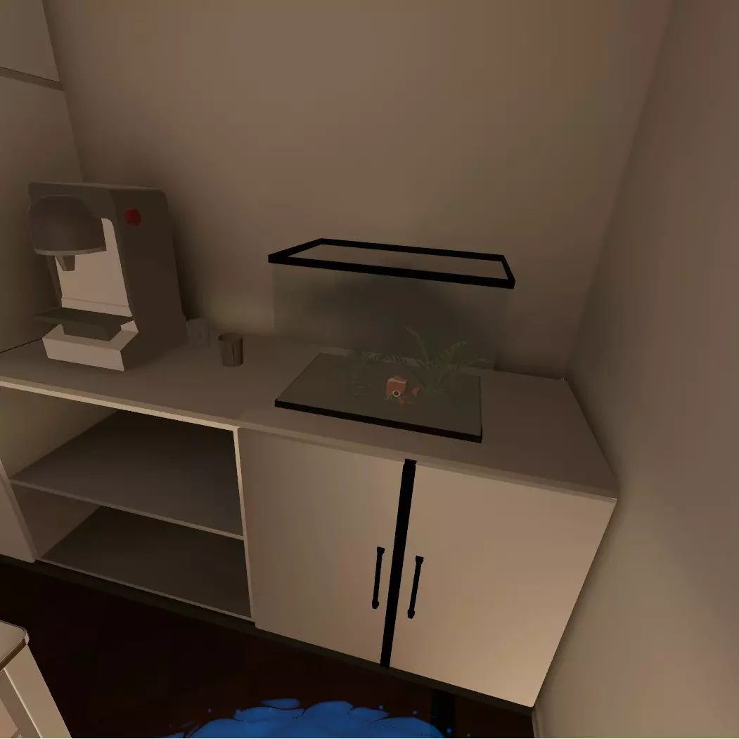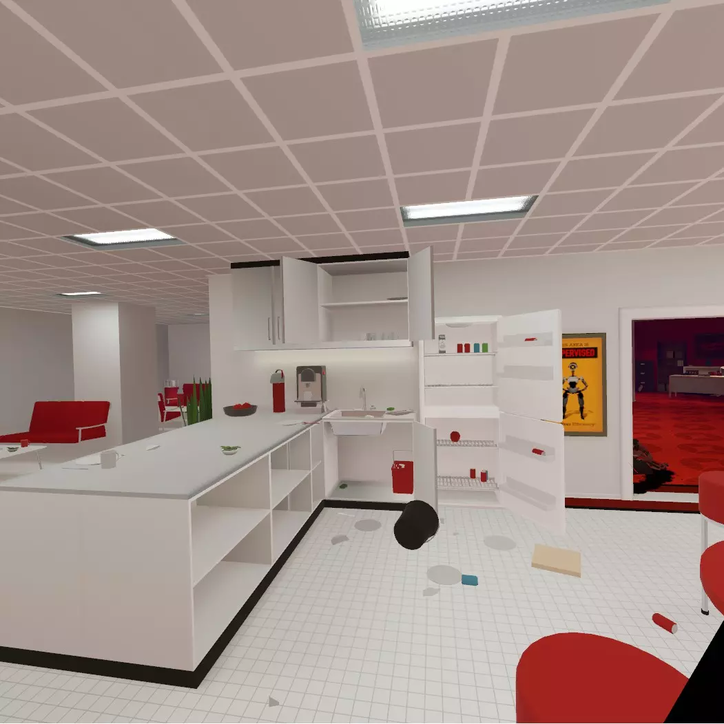 从休息室抬头,通过打开的窗户传送。你现在会进入一个厨房类型的区域。