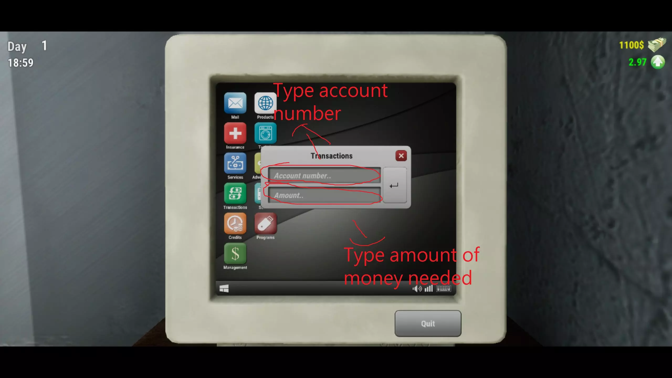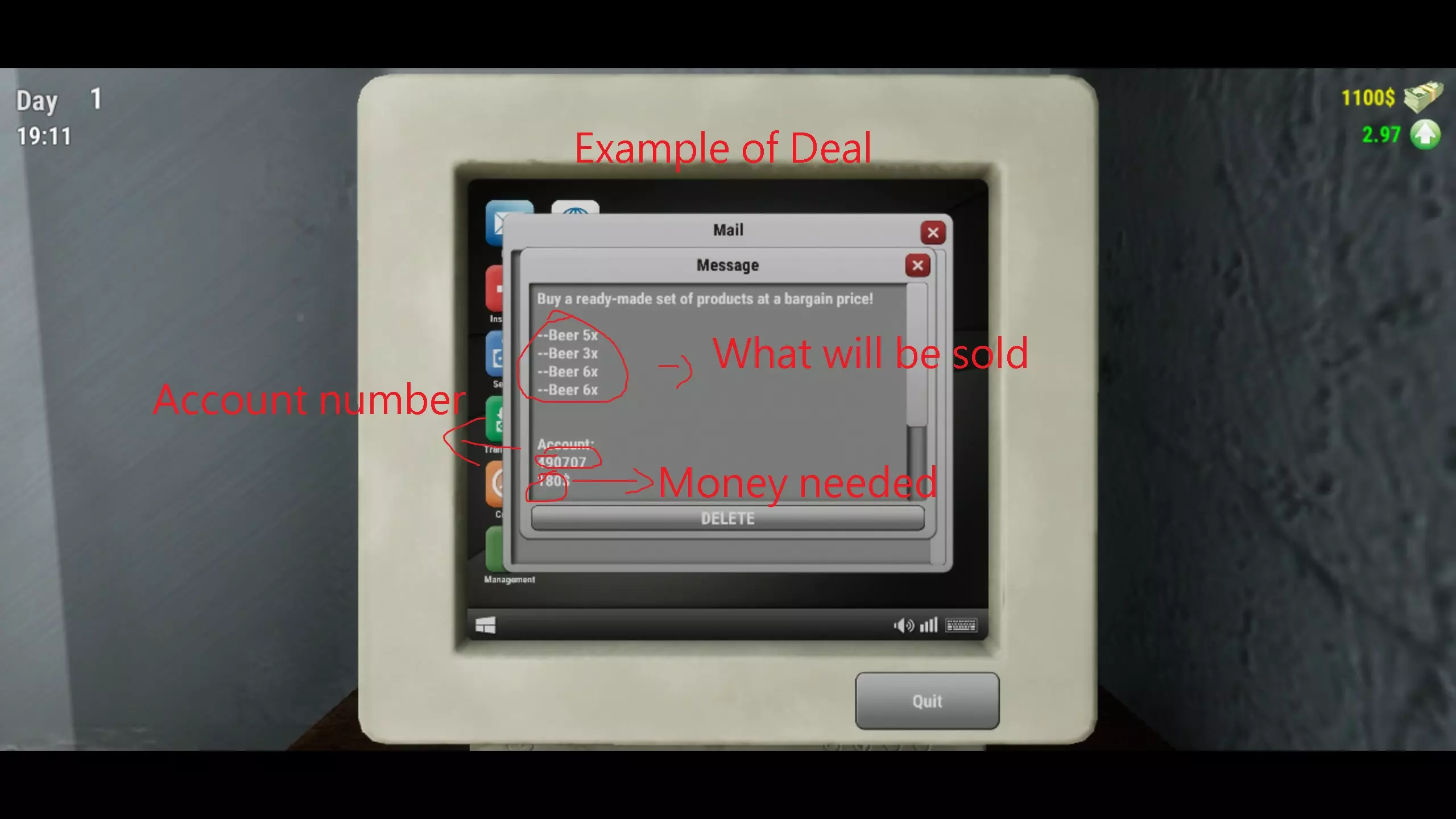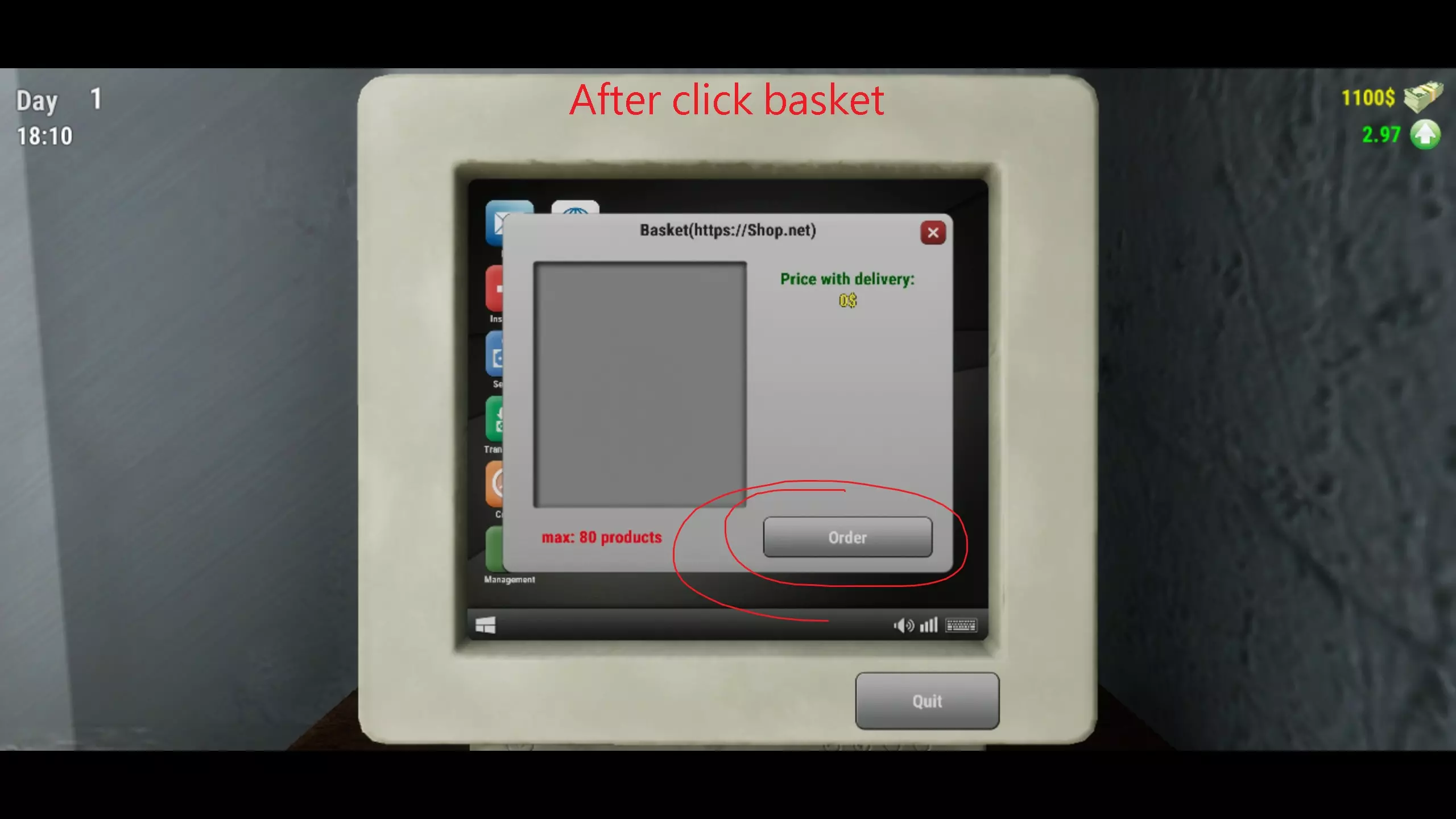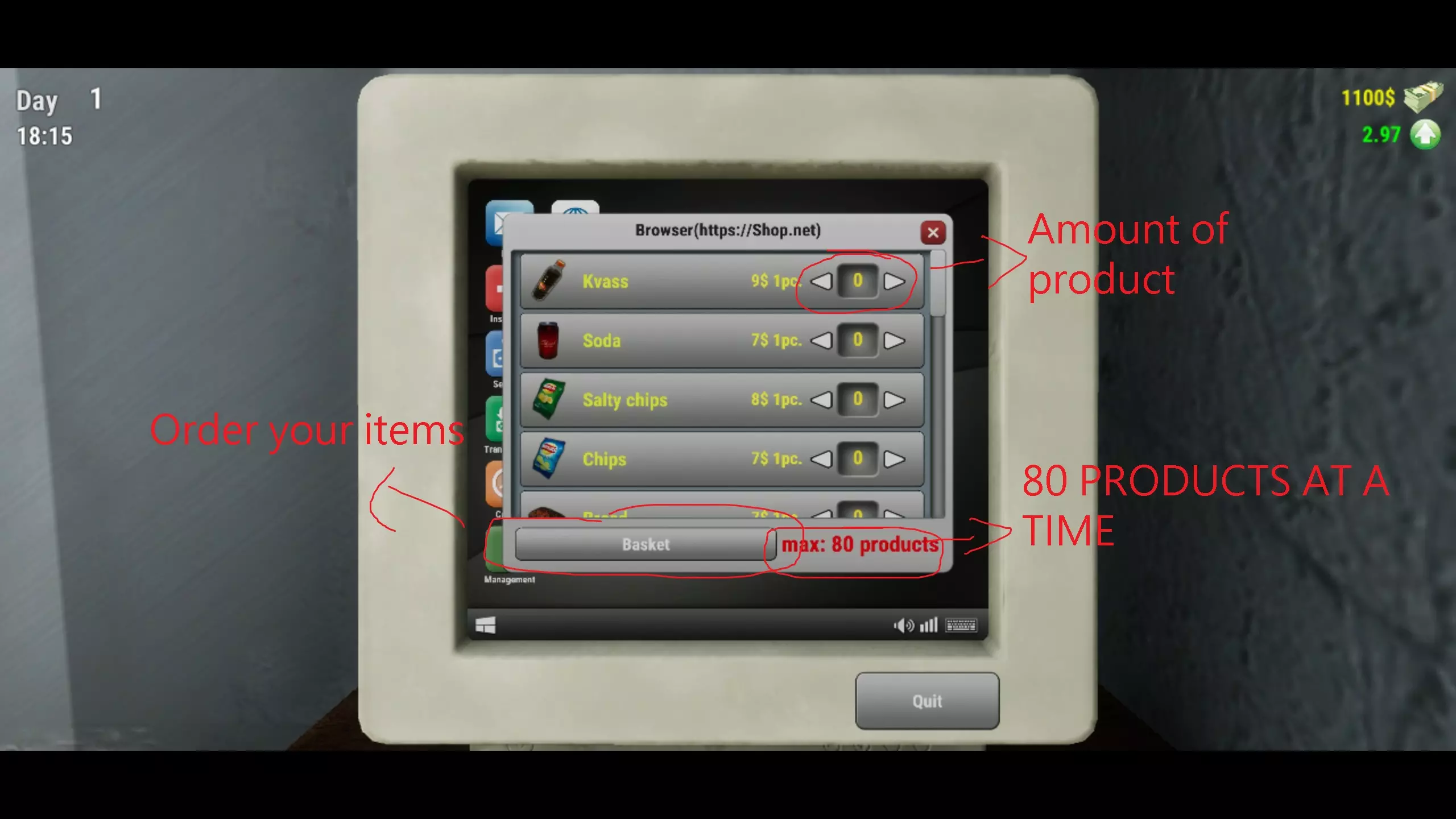窗户打开时,表示你的商店正在营业。窗户关闭时,商店则停止营业,人们不会尝试从你这里购买商品。当有顾客前来时,你需要找到他们想要的物品。假设他们想要克瓦斯,你要找到克瓦斯并按住左键拿起它。这样就能抓住物品,然后走向顾客并按F键将克瓦斯扔向他。希望你别笨到扔偏了。如果扔偏了,那就再试一次,你这个笨手笨脚的家伙。如果克瓦斯碰到顾客,你就会收到付款,并且系统会记录你已向他提供了克瓦斯。如果你给错了物品,他会把东西还给你。继续为顾客服务,直到某种商品售罄。比如,顾客把克瓦斯买光了,这时你就必须到电脑前订购商品。 电脑:
