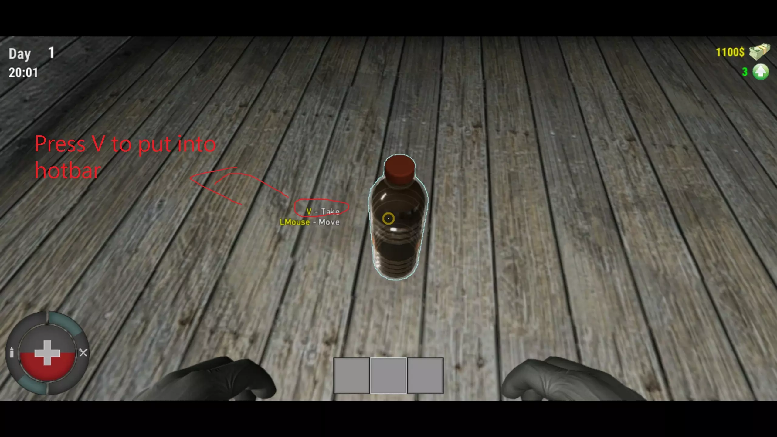 滚动条 - 用于横向移动快捷栏 你还会注意到游戏中有状态值,包括饥饿度、口渴度和生命值。你可以通过选中想要食用或饮用的物品并按下V键来进行吃喝操作。