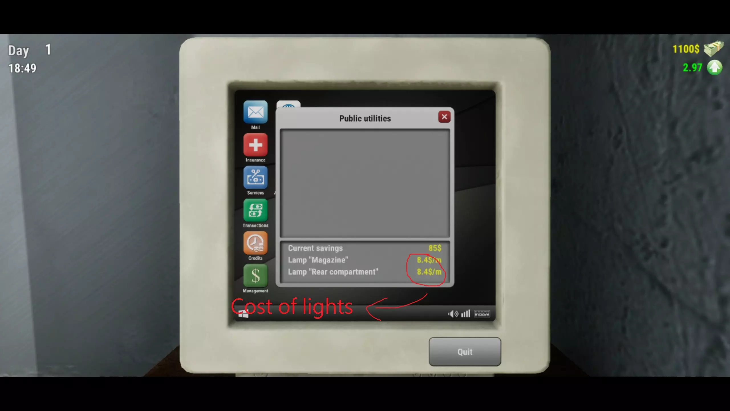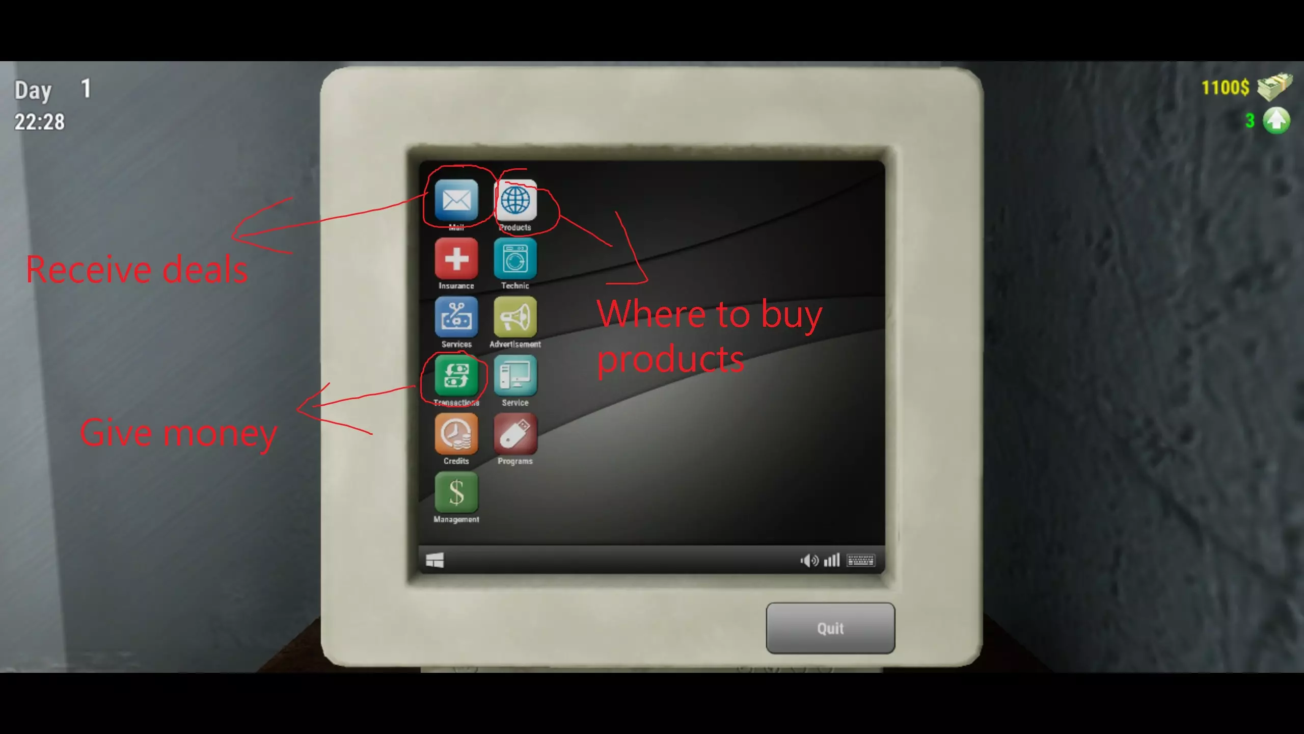 【信用值(带硬币的时钟图标)】:获取贷款。 【管理(美元符号图标)】:调整商品价格。 【商品(浏览器图标)】:用于购买物品。