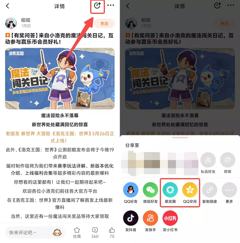 参与方式详解:点击页右上角分享按钮→选择分享至朋友圈或QQ空间点击发表后截图即可~