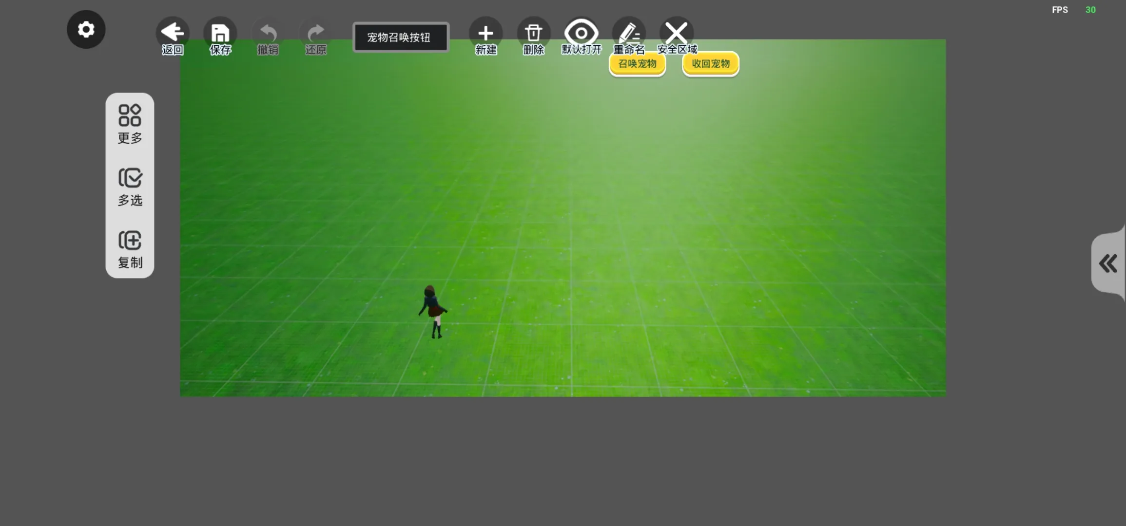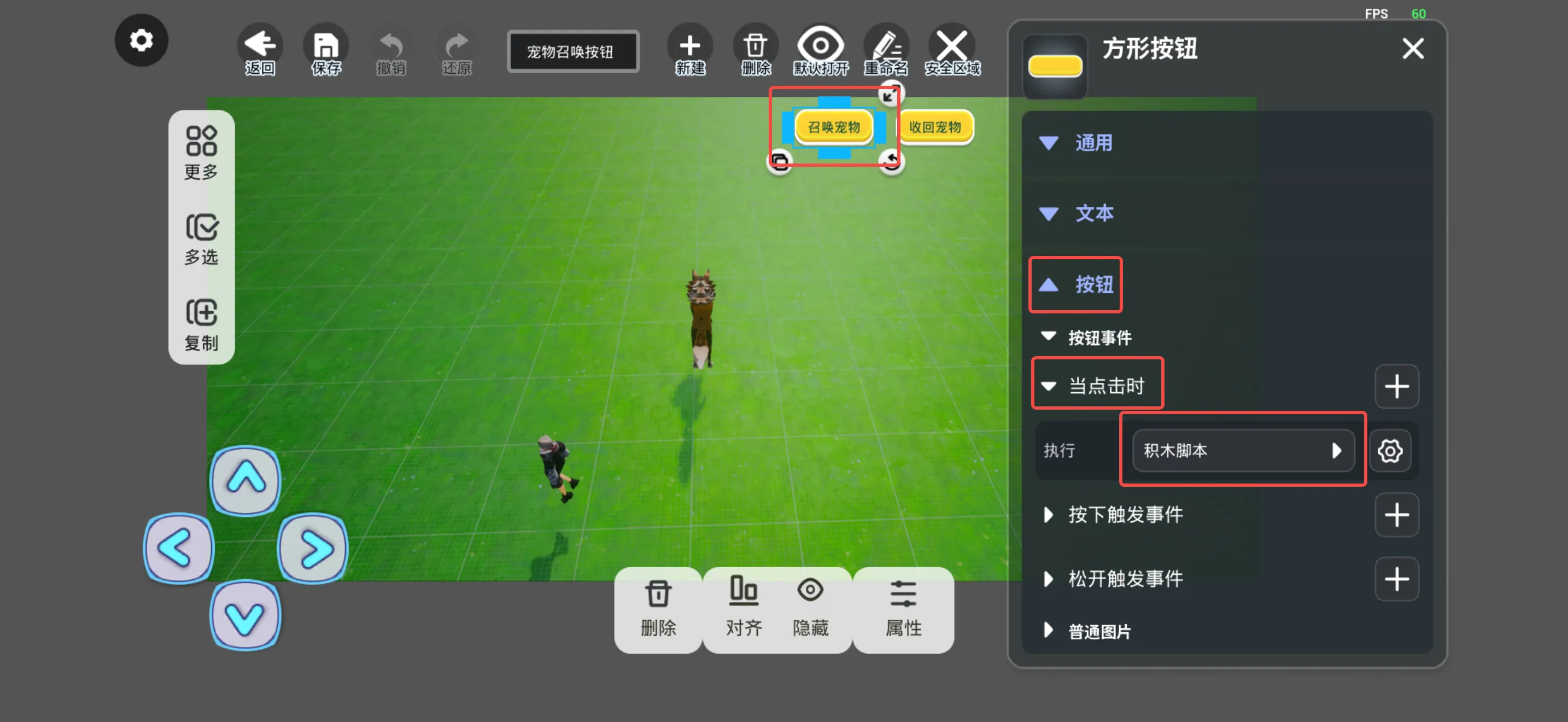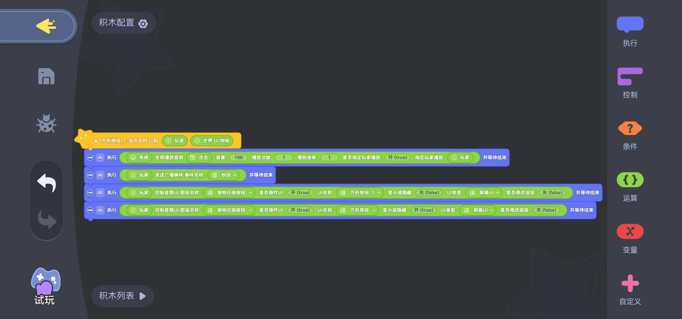 步骤四:点击“召唤宠物”按钮——属性——按钮——按钮事件——当点击时——积木脚本,便能够看到下图所示的积木逻辑内容,通常情况下需要替换的内容只有需要生成的物体以及最后一条执行指令积木,其他参数基本可不做调整