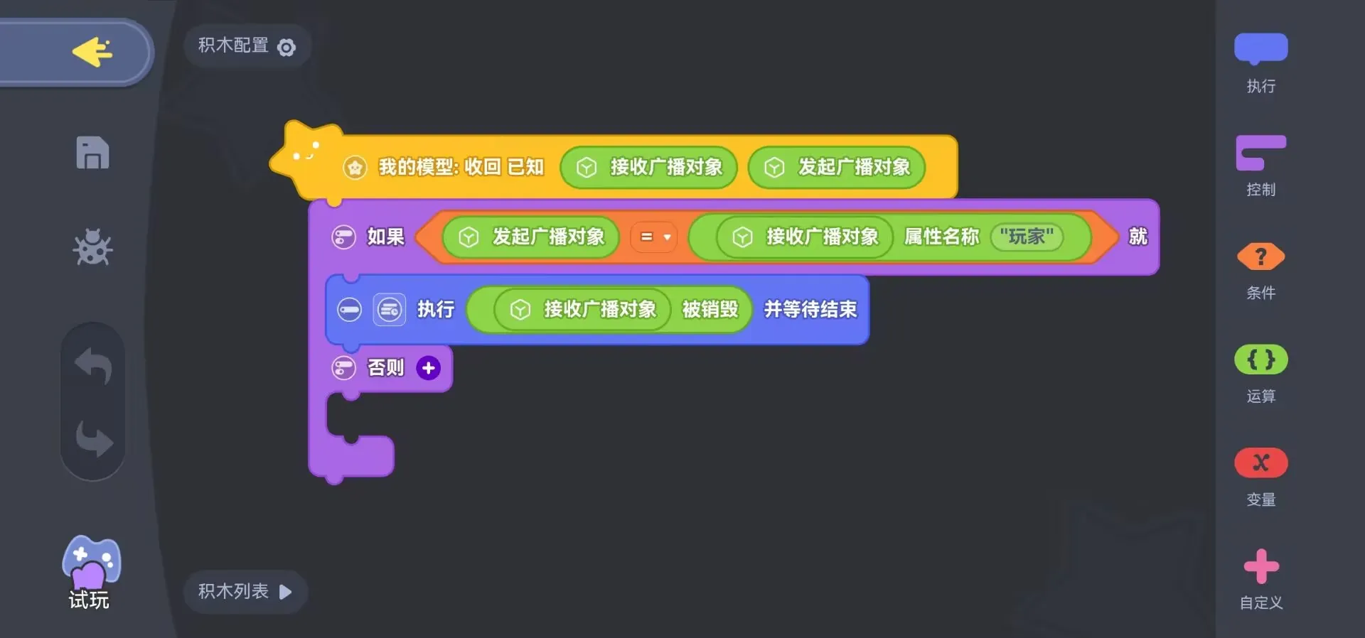 为"玩家",属性类型选择"实体对象",细分类型选择"角色",接收广播事件选择"收回"事件,并在"收回"事件其下方将刀盾狗的积木脚本写进去。