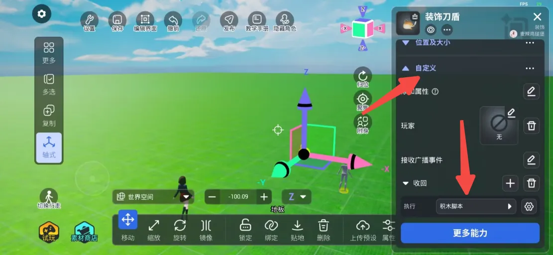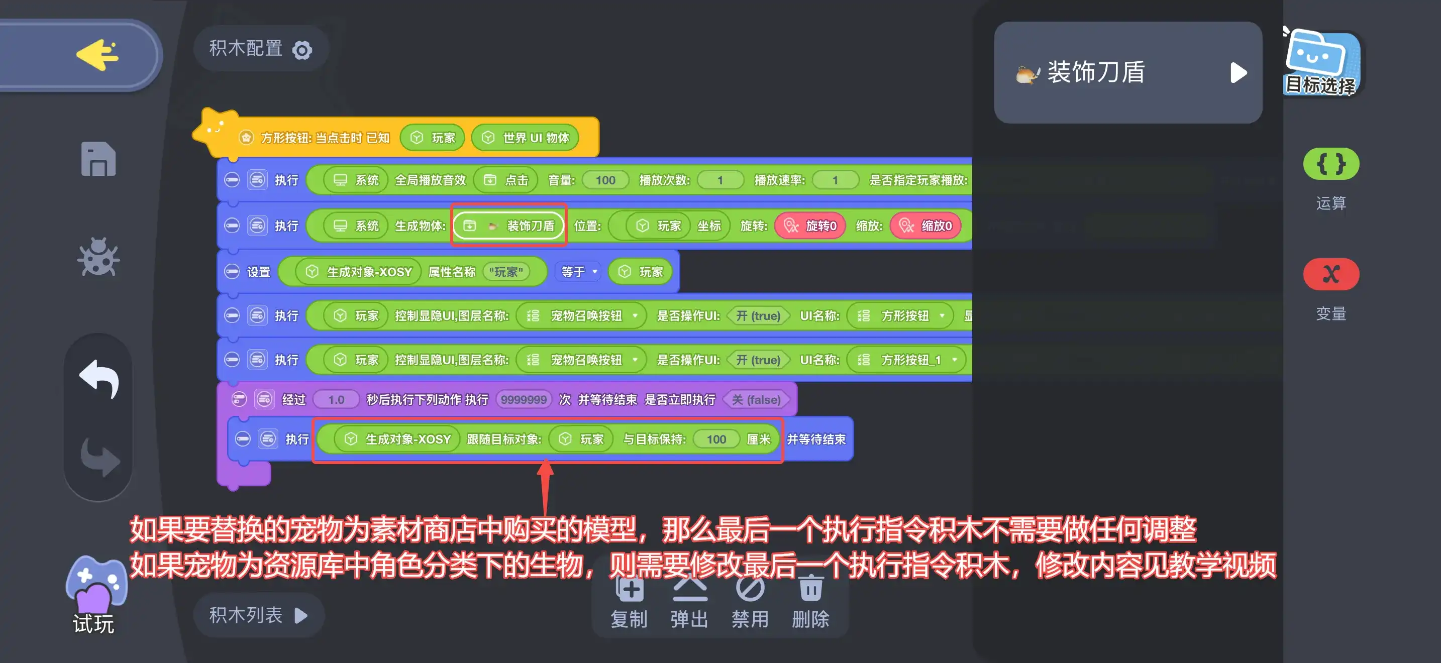 步骤一:从素材商店内搜索“宠物召唤按钮”并导入,然后从装饰中拖出"装饰刀盾"模型,找到并按照它的积木脚本将对应的逻辑赋予给新的模型