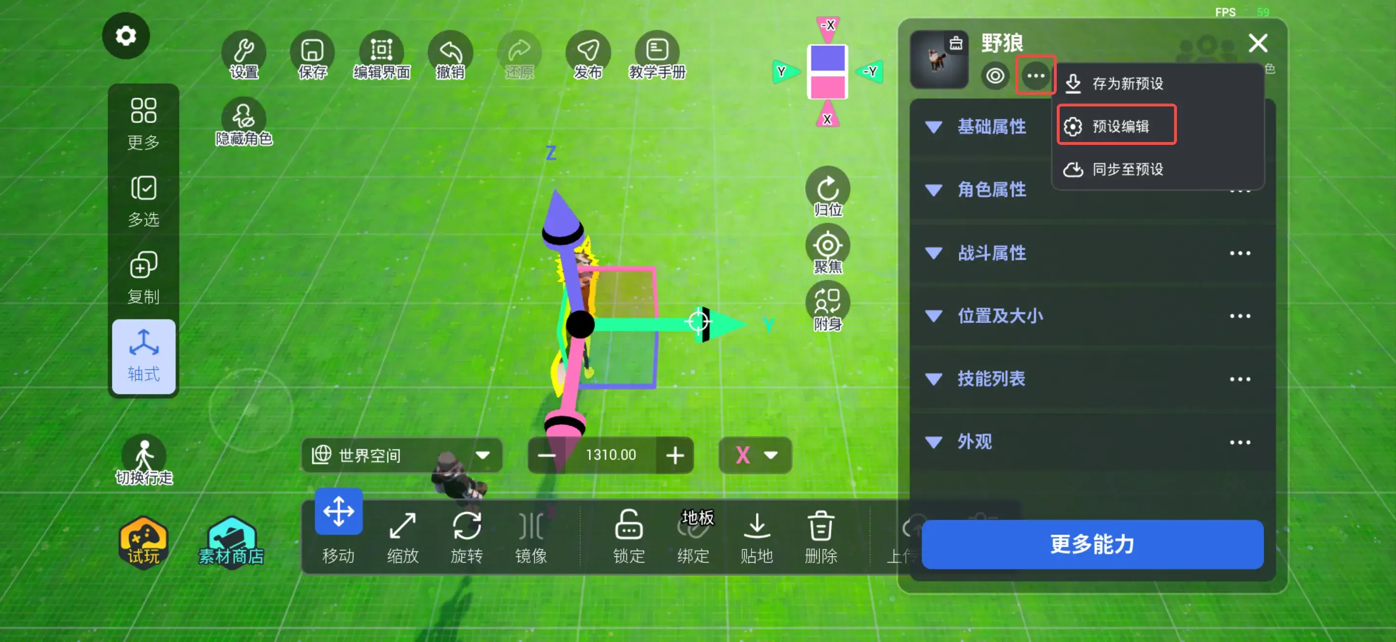 步骤三:从【资源库】→ 【角色】→ 【生物】中拖一个宠物放置在场景中 或 从素材商店购买宠物模型放在场景中,选中宠物查看属性,点击进入预设编辑,点击更多能力添加自定义组件,添加自定义属性,属性名称设置