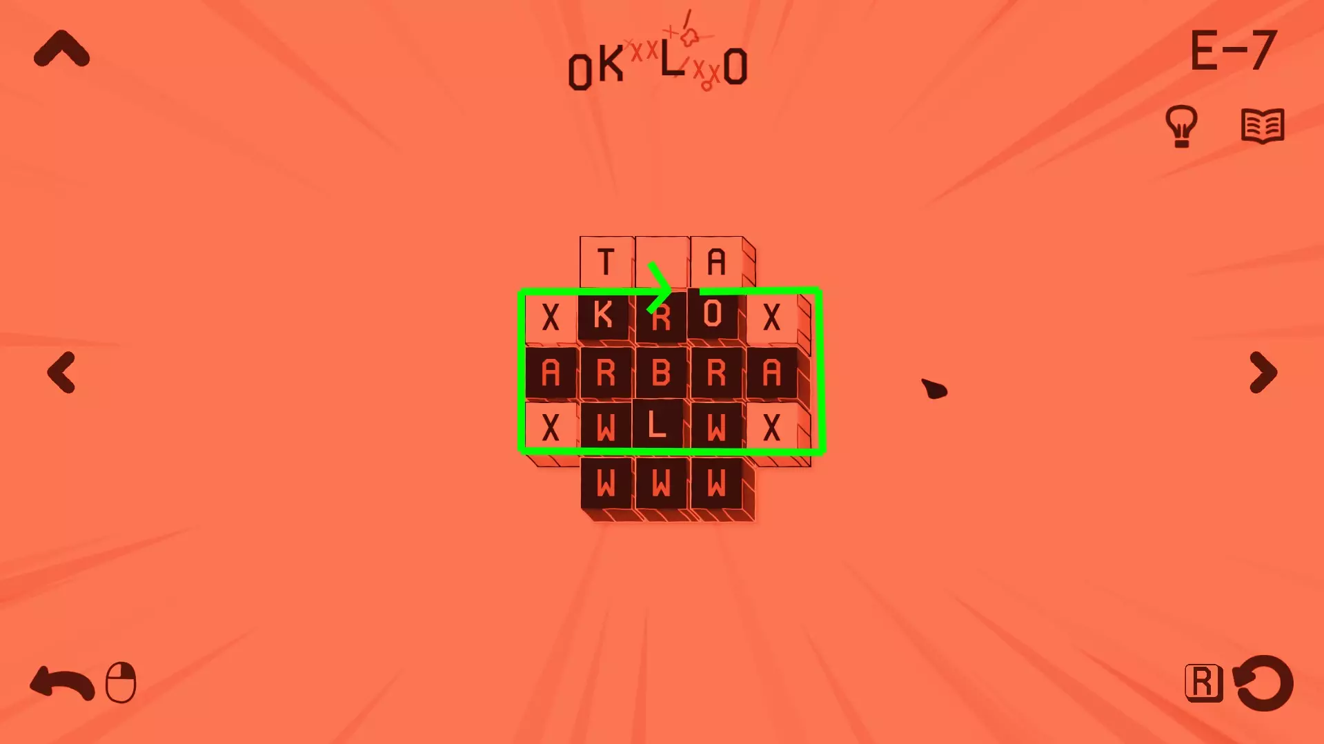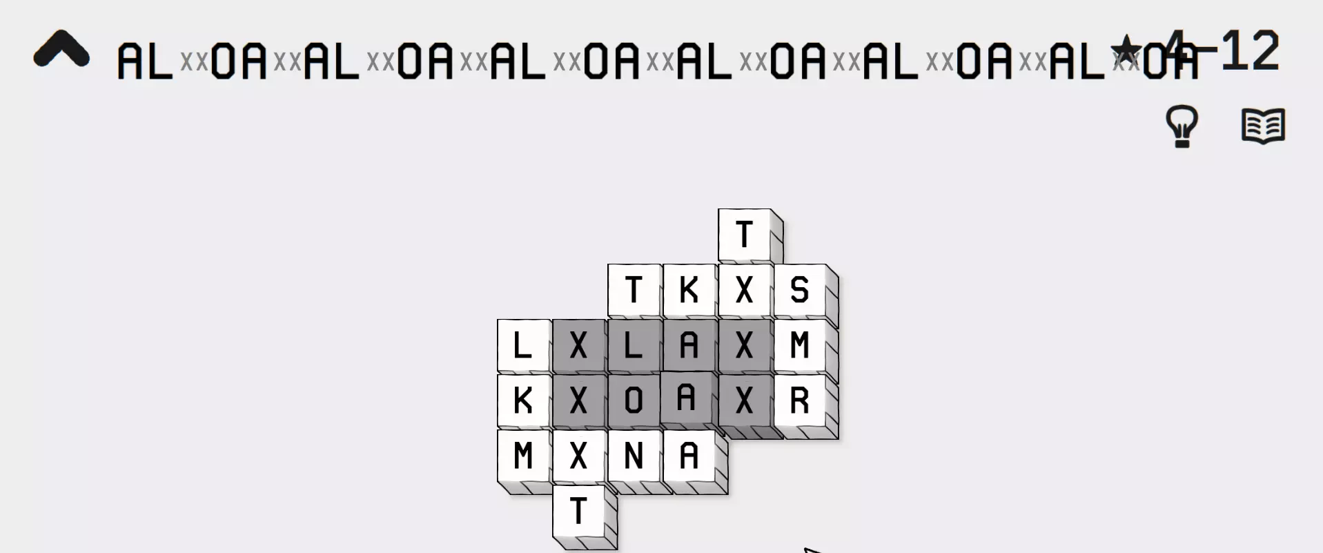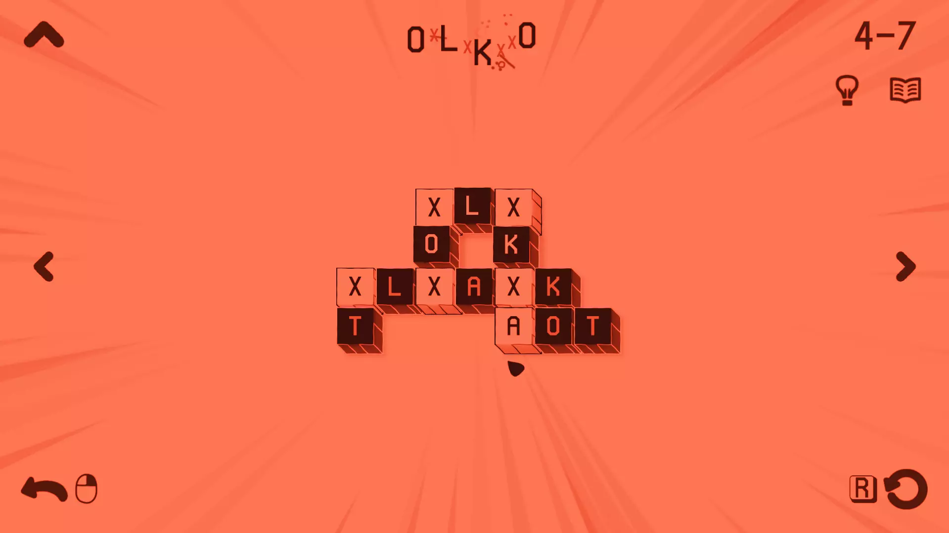 过载 拼出一个特别长的单词 在此处,你需要找到一个包含【X】循环的关卡,该循环能让你不断循环,通过重复循环模式来拼出任意长度的单词。 你可以在4-12关卡尝试。