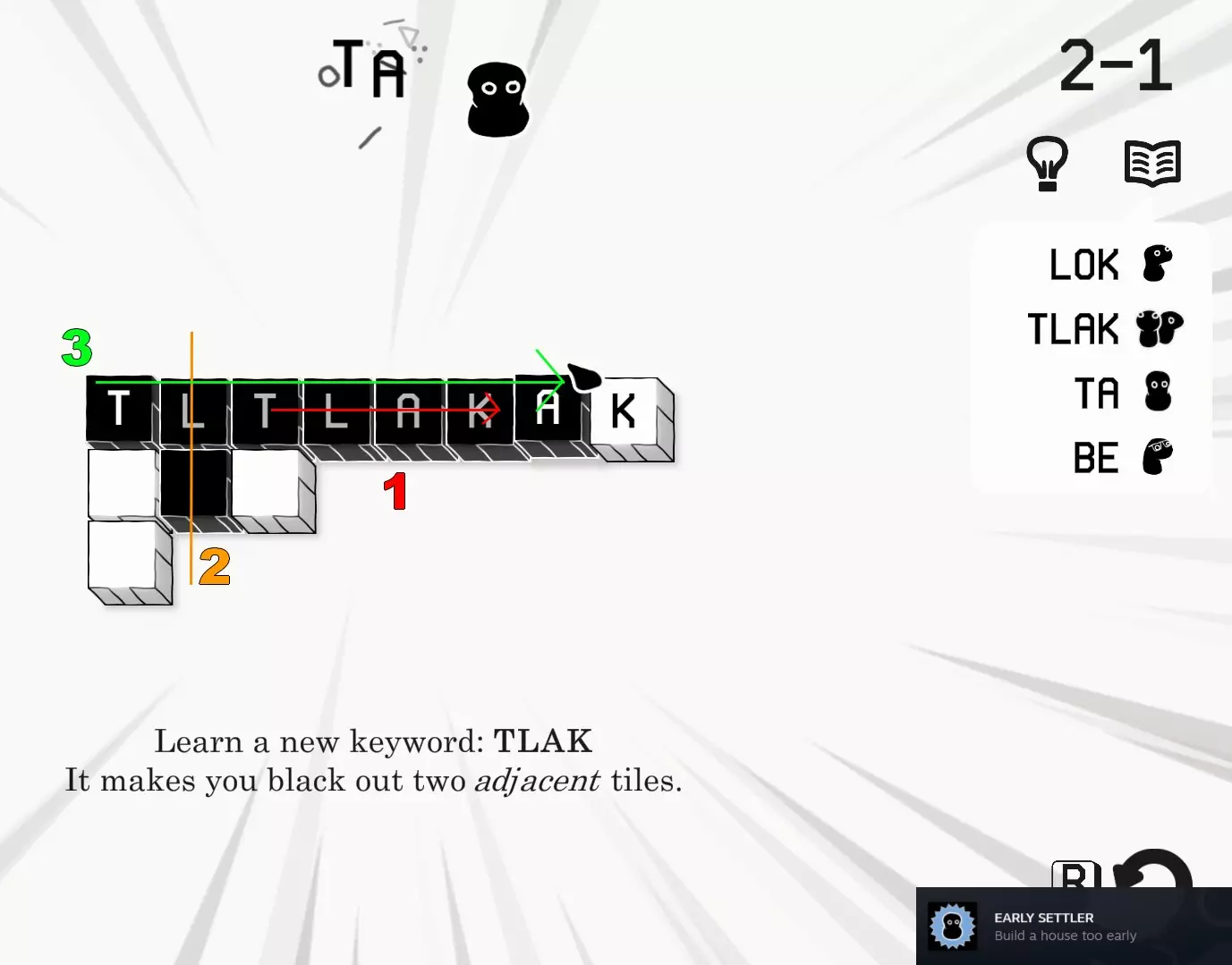 该成就可通过在游戏教导你之前使用关键词【TA】(在世界3学习)来获得。我能复现此成就的最早关卡是2-1。如图片所示,若使用第一个【TLAK】(1)移除另一个【TLAK】(2)中的【L】,你就能拼出【TA】!